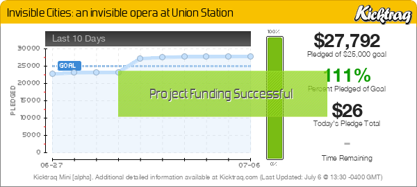 Проект Invisible Cities: an invisible opera at Union Station запущен на Кикстартере 6 июня 2013. Окончание: 6 июля 2013. Цель: собрать 25 тысяч долларов. На 10 июня собрано 8 тысяч долларов.