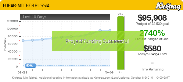 Проект FUBAR: MOTHER RUSSIA запущен на Кикстартере 3 сентября 2013 года. Окончание кампании: 8 октября. Цель: собрать 3 500 долларов. На 16 сентября собрано 56 260 долларов.