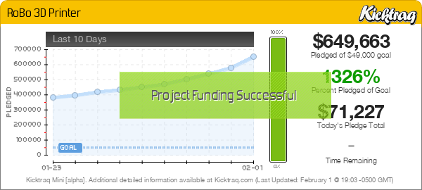 Проект RoBo 3D Printer запущен на Кикстартере 18 декабря 2012. Окончание: 1 февраля 2013. Цель: собрать 49 тысяч долларов. На 24 декабря 2012 собрано более 50 тысяч долларов.