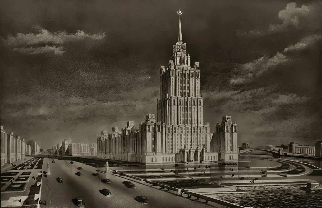 Высоко поднявшееся здание должно войти в грандиозную панораму, раскрывающуюся с Кропоткинской, Кремлевской и Котельнической набережных. Оно составит единое целое с такими сооружениями, как величественный монумент Дворца Советов, сказочный древний Кремль и высотный жилой дом на Котельнической набережной.