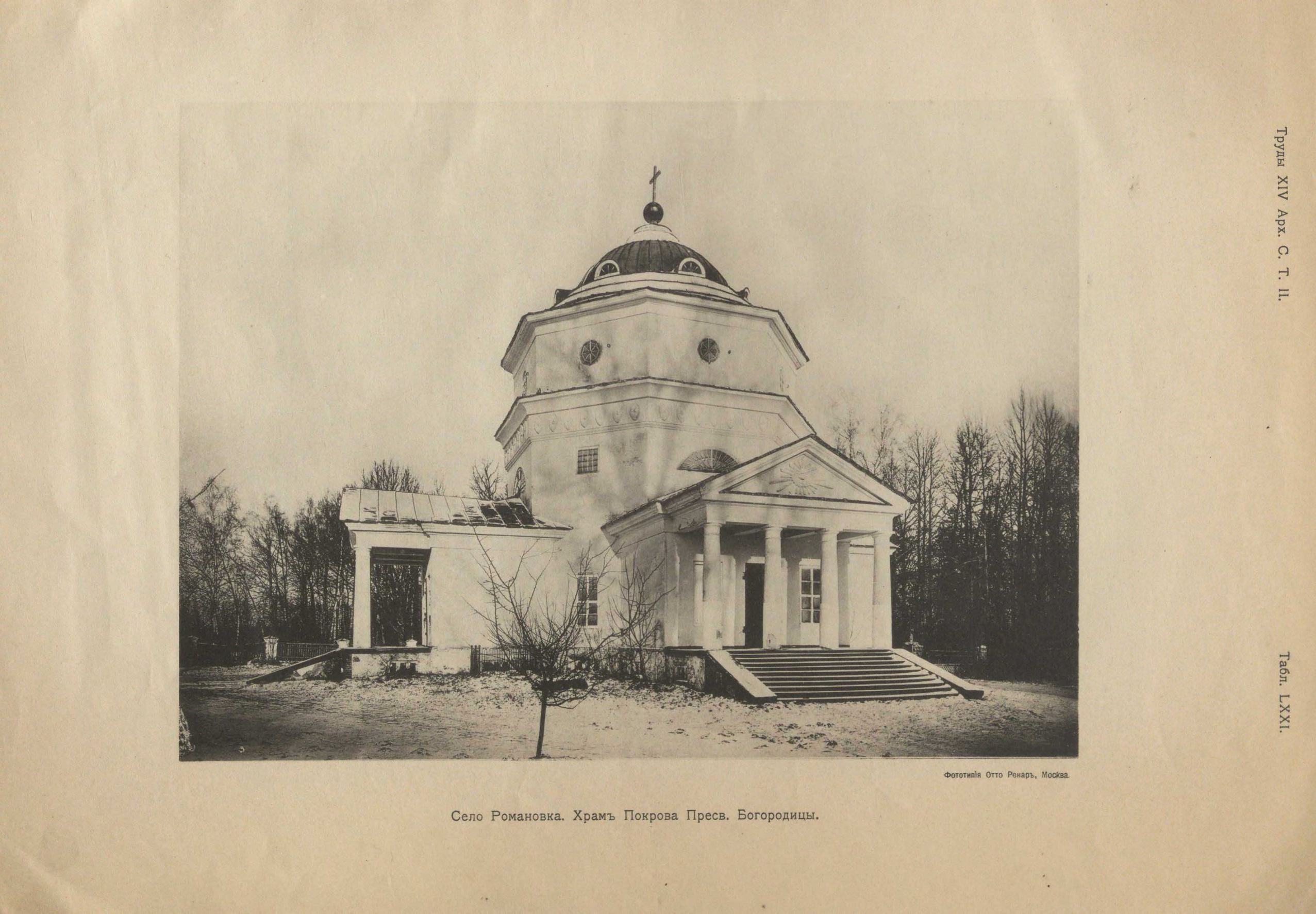1) В настоящее время Покровская церковь служит сельской церковью сельца Романовки. Невдалеке находится дом бывших владельцев (постройки архитектора Ефимова), ныне принадлежащий г-же Дуниной-Барковской, очень озабоченной порчей икон. Ею возбужден вопрос о передаче иконостаса какому-либо столичному Музею.