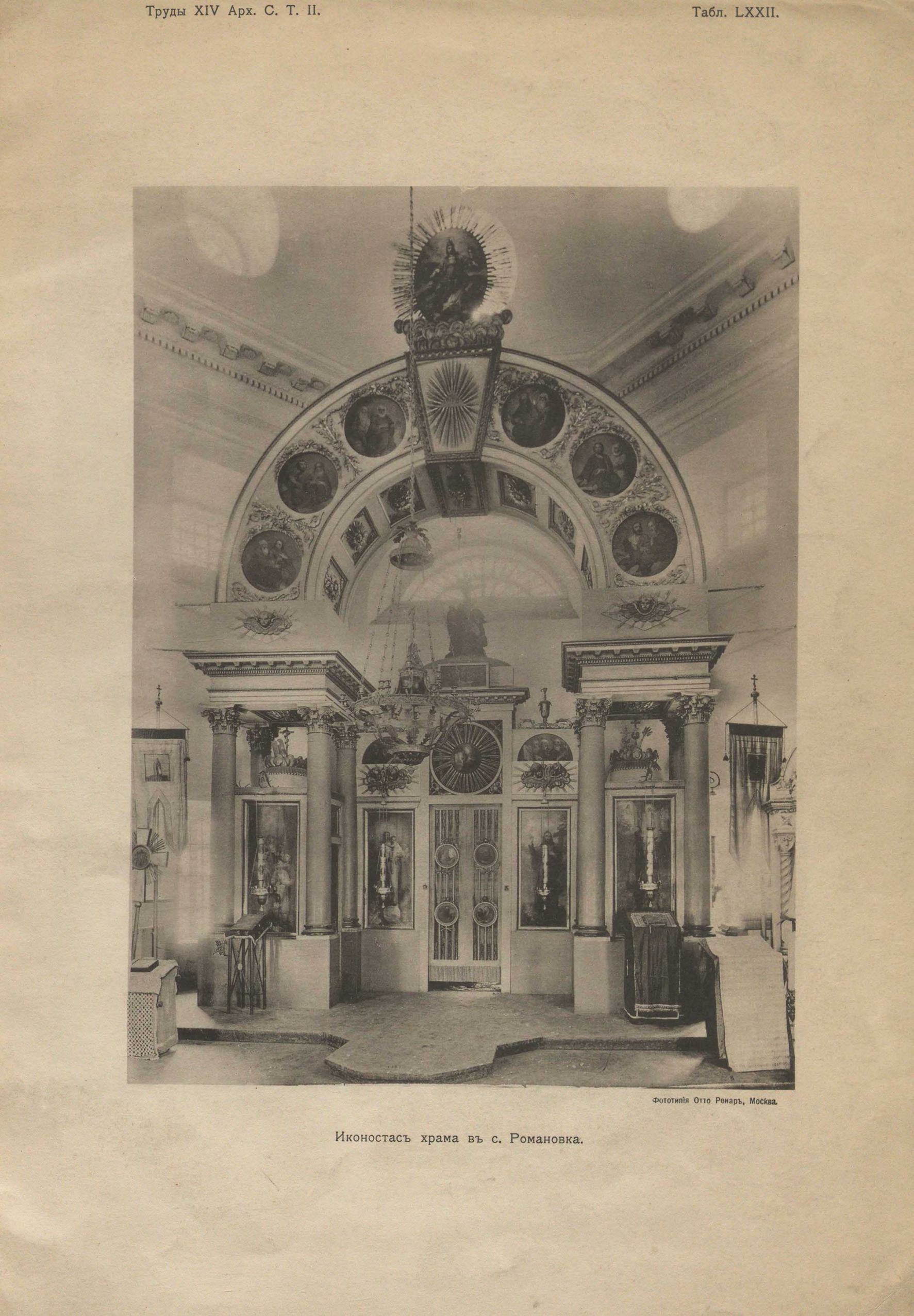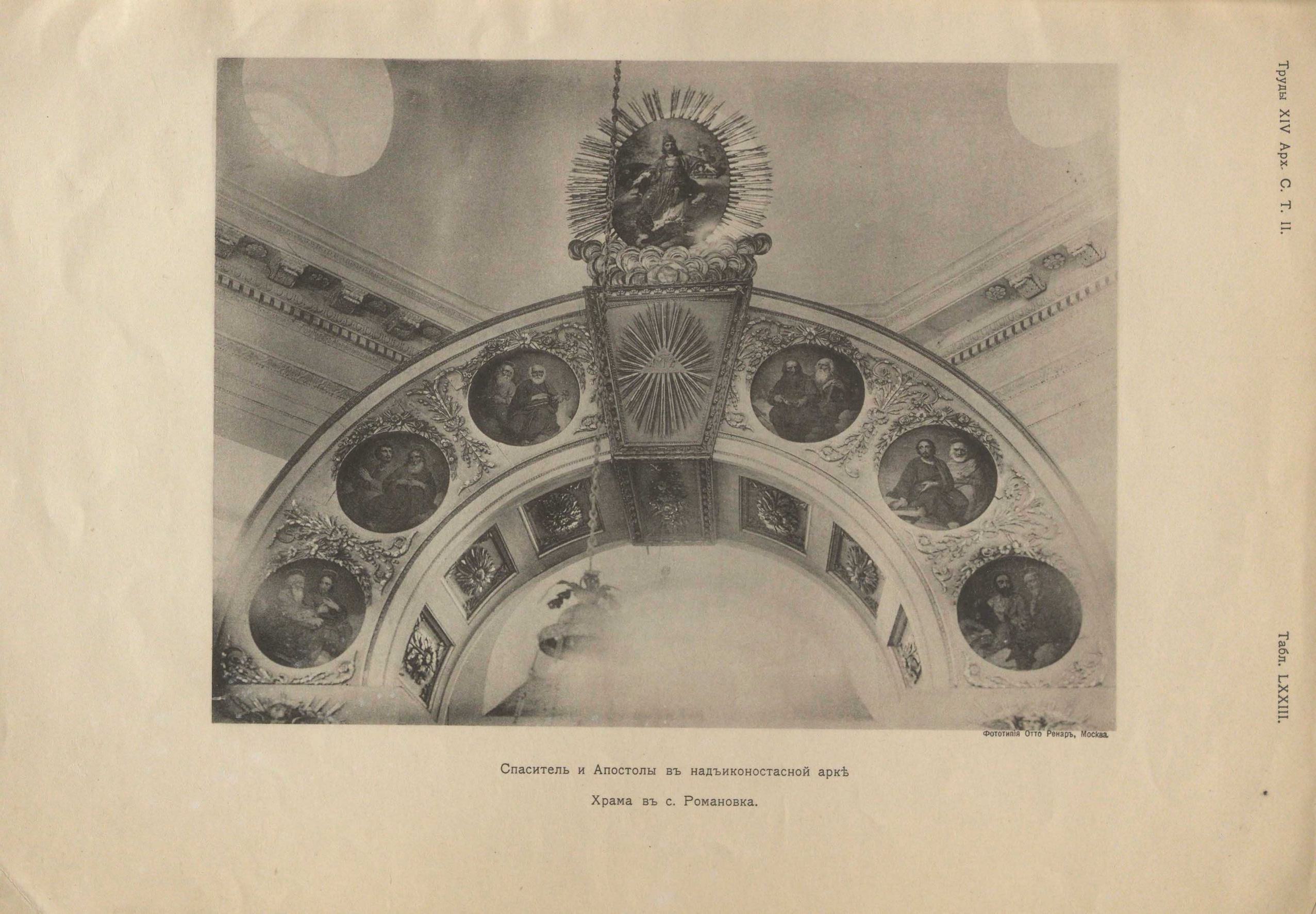 Романовский иконостас (табл. LXXII) представляет довольно распространенный в то время прием триумфальной арки, в стиле «Empire», увенчанной фигурой Христа, во славе, с сиянием вокруг. По самой арке, в кругах, расположены апостолы (табл. LXXIII). Арку поддерживают устои, все три стороны которых заняты иконами, с лица и с внешних боков — местными и с внутренних — иконами Архангелов, на северных и южных дверях. Над ними помещены изображения Нерукотворенного Спаса и усекновенной главы Иоанна Предтечи1). В глубине арки помещен высокий портал царских врат, увенчанный группой «Распятия». (табл. LXXIV). Его своеобразный силуэт рисуется в середине триумфальной арки и служит центральным пунктом всей композиции иконостаса. Ниже «Распятия», в аттике портала, находится изображение «Тайной вечери», почти дословное повторение известной «Тайной вечери» Леонардо да Винчи, находящейся в трапезной монастыря Santa Maria delle Grazie в Милане. Разница встречается прежде всего в размере, хотя Боровиковский, как завзятый миниатюрист, легко справился с значительным уменьшением, и фигуры Спасителя и Апостолов верны оригиналу. Затем выдвинуты по другую, ближайшую, сторону стола фигуры Иуды, с левой стороны, и стоящая фигура апостола Филиппа, с правой. Видоизменена несколько и обстановка: над головой Христа помещены «скрижали завета», с двумя горящими свечами по сторонам. Ниже «Тайной вечери», в неподвижной фрамуге царских врат, помещено, небольшое по величине, изображение «Благовещения», окруженное сиянием, — очень тонкое и сложное по письму, но, к сожалению, помещенное слишком высоко (табл. LXXX, I). На полотнах царских врат, в медальонах, размещены в обычном порядке фигуры Евангелистов (табл. таже 2—5). Направо и налево от царских врат, замыкая пролет триумфальной арки, находятся местные иконы Спасителя н Богоматери, а над ними, в полуциркулях, — сонмы Пророков. Весь иконостас производит впечатление необыкновенного изящества, стройности и согласованности живописи и архитектуры. Обильное, но не резкое, освещение придает иконостасу мягкость и воздушность.