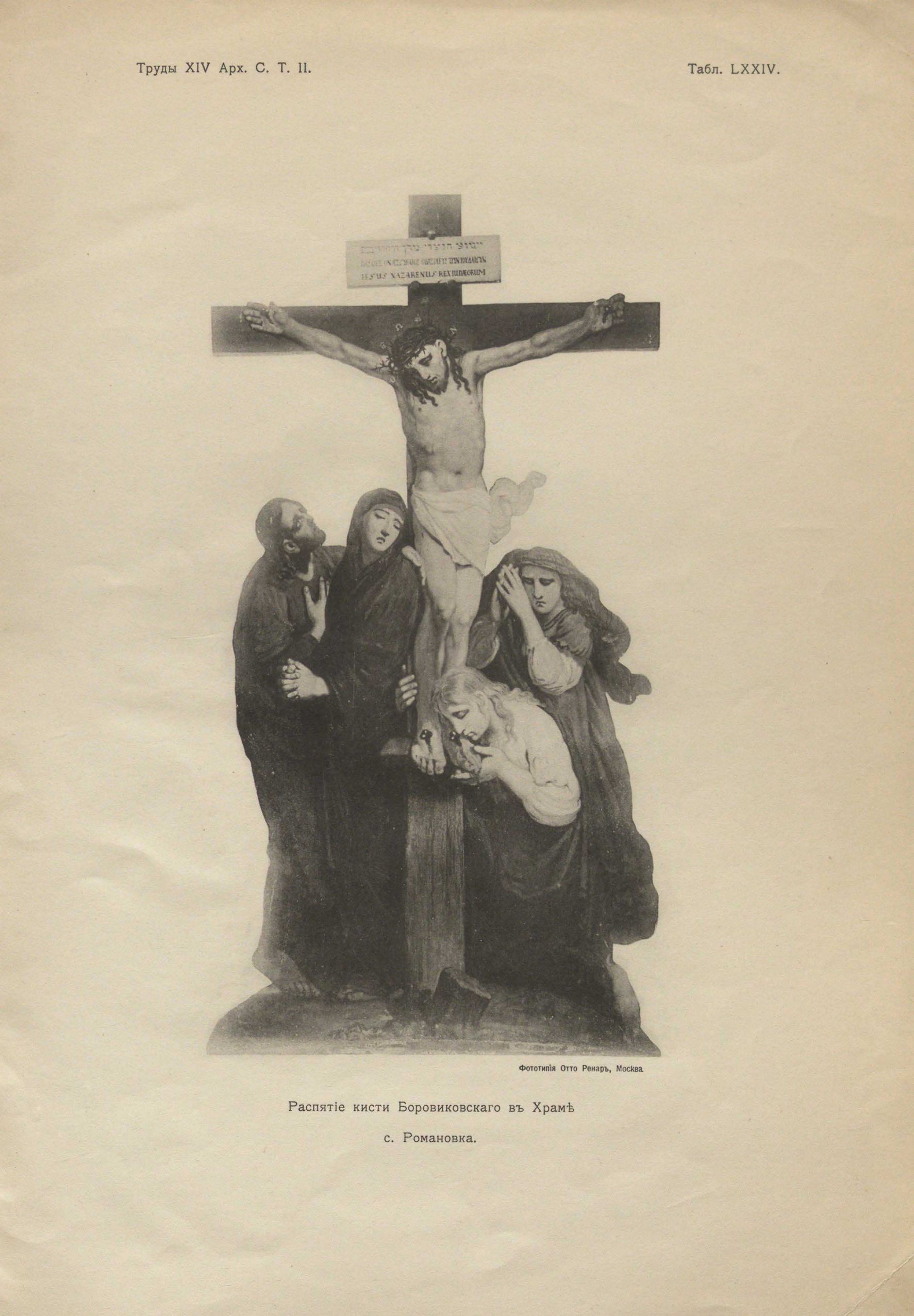 Потрясающее впечатление производит группа «Распятия» (табл. LXXIV), экспрессивно передающая напряженное душевное страдание, как бы переходящее в физическую боль. Особенно выразительна Богоматерь: скорбь ее неизреченна, невыносима и она в отчаянии и изнеможении ломает руки. Св. Иоанн, затаив дыхание, как бы сам ощущает страдания Христа... Глубокой печалью и страданием веет от этого высоко художественного произведения.