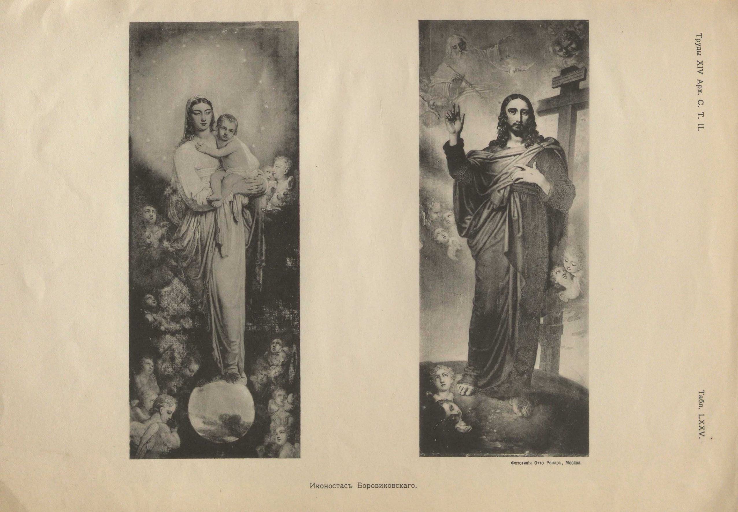 Сильный и проникновенный в области религиозного искусства, выдающийся талант, художник — портретист Владимир Лукич Боровиковский1), произведения которого достаточно известны, написал целый иконостас, состоящий из двадцати шести икон. Иконостас находится в Покровской церкви села Романовки Мглинского уезда, Черниговской губ. (табл., LXXI) и мало кому известен. Между тем он представляет высокую художественную ценность и доставляет истинное художественное наслаждение своей экспрессией, замечательной тонкостью письма и колоритом. К сожалению, разрушение уже коснулось этих изящных полотен2) и многие из них удручают своим не поправимым видом3). История возникновения этого иконостаса не сложна. Выдающаяся известность художника-земляка, славного в религиозной живописи, несомненно побудили черниговского помещика Лашкевича пригласить Боровиковского написать иконостас для выстроенного им в 1811 году Покровского храма. Судя по изяществу сооруженной церкви, Лашкевич был большой любитель и знаток искусства. Боровиковский предложение принял и исполнил в 1814—1815 году. У каждого религиозного живописца есть свое представление божества, божественности, святости. У Боровиковского оно может быть пояснено словом, — необыкновенная высшая красота в мире любви и кротости. Все лица, им изображаемые, идеально прекрасны и жизненны, но жизнью высшей, одухотворенной. Прекрасная тонкая выписка фигур его произведений в мельчайших подробностях одежды и аксессуаров, воспринята им от Левицкого и Лампи и развита в высшей степени, по всей вероятности, благодаря раннему занятию иконописью дома, в семье отца. Прелестная группировка и великолепный колорит довершают обаятельную прелесть его композиций. Но не в одной технике и колорите и, даже, не в экспрессии заключается чарующая, захватывающая своей одухотворенностью, прелесть изображений. Имеющиеся свидетельства и собственные записки художника говорят о высоком религиозном настроении художника. Приступая к какой-либо важной, религиозного характера, работе, Боровиковский отправлялся в церковь, где слушал молебен, затем читал Евангелие или житие изображаемого святого. Одним словом поступал так, как поступали старинные иконописцы. Горячий мистик, близко принимавший к сердцу все высокое, он в собраниях религиозного кружка Е. Ф. Татариновой пел, пророчествовал и, по его словам, «приходил в сокрушение, и слезы лились». Работая над религиозным сюжетом, он прилагал всю глубину психического анализа и входил, по его же словам, «в проникновенность высоким религиозным настроением». Изображаемые им религиозные сюжеты, несмотря на то, что по стилю и характеру своему более приближались к картинам западной католической трактовки, носят глубокий православный характер. Это не просто изображение событий, это не просто картины, а иконы, и в них Боровиковский, как бывший иконописец, остался верен себе. Это и есть высшее достоинство художника, сумевшего в конкретных условных формах передать чувство своей веры. Произведения Боровиковского поэтичны, чарующи, понятны, и нет на Руси уголка, где бы не нашлось копий с его известных произведений. Его произведения в свое время были много популярнее, чем в настоящее время произведения кисти В. М. Васнецова.