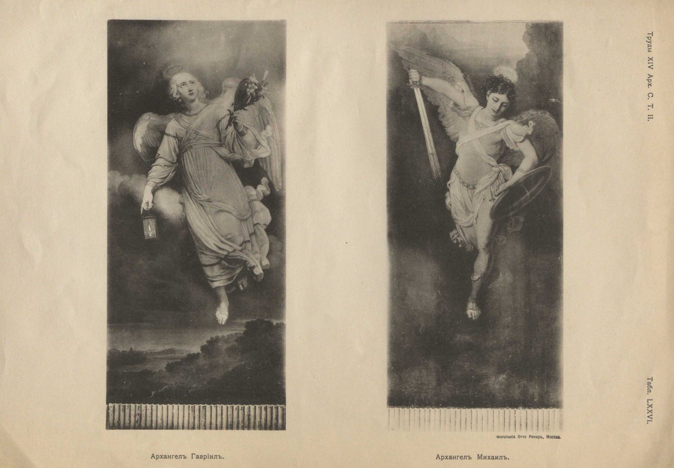 Традиционные изображения «Благовещения» и Евангелистов в руках Боровиковского нашли особое выражение. В «Благовещении» с необыкновенным подъемом, мистически глубоко, передан совершающийся великий момент. Все небесные силы присутствуют тут, ими напоен воздух. Особенно ярко и сильно выражен сходящий Св. Дух, стремительный ореол которого освещает всю группу, придавая ей таинственно глубокое выражение. Особенно великолепно освещение Архангела Гавриила. В ликах Евангелистов сильно проведена соответствующая их духу экспрессия. Сосредоточенно задумчивый Евангелист Матфей изображен спокойно пишущим свое повествование. Углубившийся Марк с созревшей мыслью уже заносит руку над хартией. Прекрасно изображение Евангелиста Луки, как бы обдумывающего изложение своего повествования; хартия его еще закрыта. Вдохновенно восхищен Евангелист Иоанн, высоко приподнятая его рука как бы спешит на лету схватить вдохновенные мысли2)... Особенной глубиной выражения отличаются изображения Архангелов Гавриила и Михаила на северных и южных дверях (табл. LXXVI), помещенных в устоях триумфальной арки с боков3). Архангел Гавриил, вестник мира, с цветком лилии и каменным зеркалом в левой руке и с зажженным фонарем в правой, как бы освещает тьму, рассеивающуюся при его приближении4). Архангел устремил взор на небо, откуда исходит свет, как бы вслушиваясь в повеления Господни. Внизу бледный рассвет. Архангел Михаил в кольчуге стремительно спускается во тьму, готовый разить своим страшным огненным мечем; в левой руке его щит. Архистратиг не имеет грозного вида, лицо его спокойно и уверено. Свет прорывается сверху, смутно освещая силуэты гор над головой архистратига; внизу — пропасть тьмы... Оба изображения чрезвычайно эффектны в принятых контрастах и колорит их чуден. Фигуры Архангелов полны движения и выразительны в своем летящем положении.