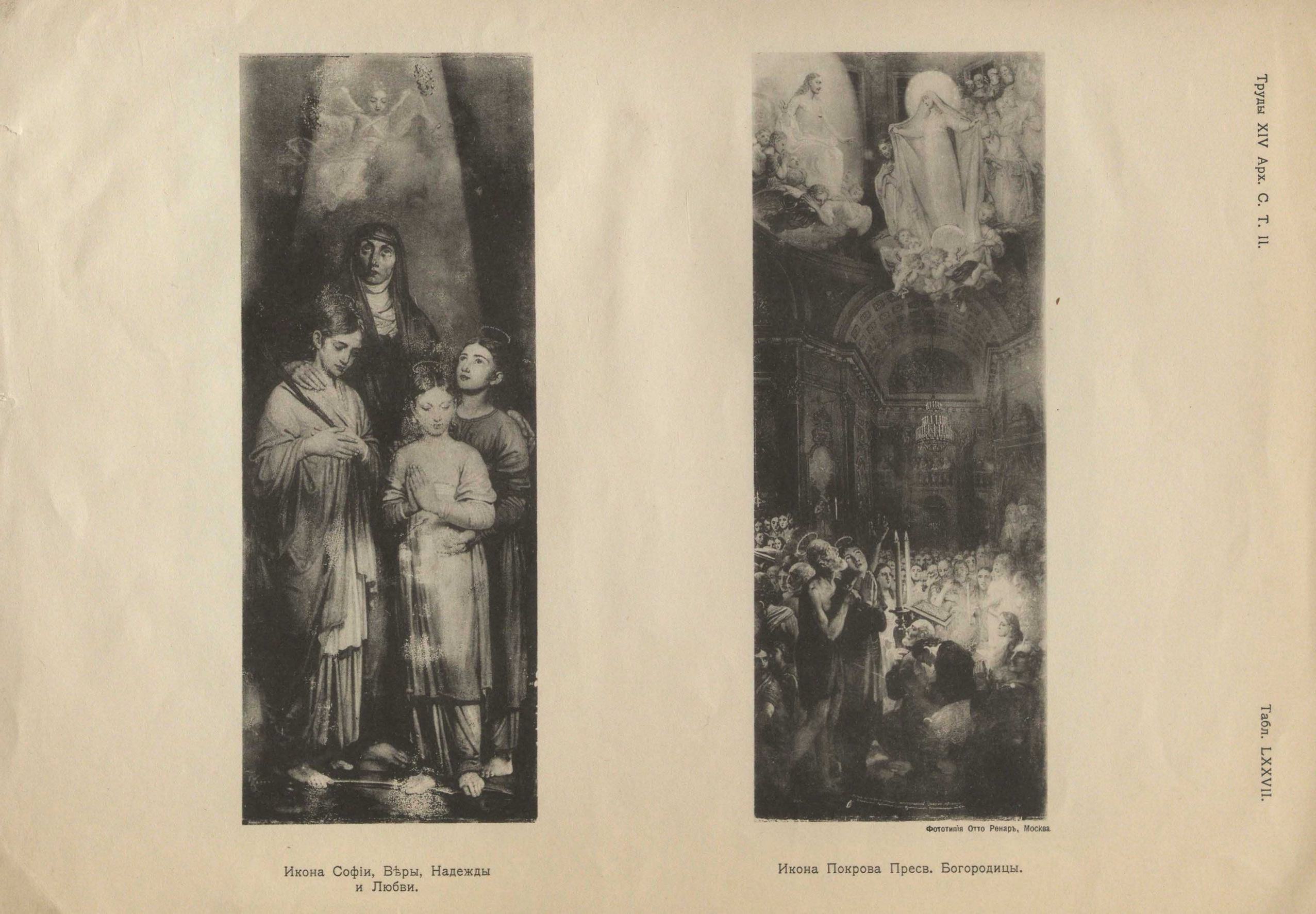 Местная храмовая икона Покрова Пр. Богородицы, находящаяся в правом устое триумфальной арки (табл. LXXVII), по своему значению является главной и, конечно, на ней Боровиковский остановил особое внимание. Это целая картина, с эффектным размещением пятен, прекрасно задуманная и широко написанная. Здесь слиты воедино и экспрессия, и колорит, и превосходно выдержана борьба двух освещений. Главное внимание приковывает молящаяся перед Христом Богоматерь среди сонма Ангелов. Глубоким мистическим выражением веет от этой чудной группы, парящей в воздухе, вверху, над головами молящихся в ярко освещенном храме. Внизу эффектны две фигуры «видящих» старика и женщины с выражением испуга, молитвы и восторга в лицах. Среди коленопреклоненных молящихся видят портрет храмоздателя. Эта чудная икона ценна еще тем, что на ней имеется подпись автора. Икона Софии, Веры, Надежды и Любви, помещенная в правом устое триумфальной арки (табл. таже), замечательна чудным колоритом и прекрасной экспрессией фигур. Вера — тихая сосредоточенность, со сложенными руками на груди, в них пальма. Надежда — с ожиданием и мольбой глядящая вверх, в небеса. Любовь изображена со сложенными руками и опущенными глазами, с тихим выражением покоя на лице1). София, страдающая за дочерей, изображена с выражением глубокой веры и скорби. Вверху, в луче, Архангел и Ангелы. Изображения Апостолов в медальонах триумфальной арки (табл. LXXIII) замыкаются в центре изображением «Всевидящаго Ока», поверх которого на облаках парит Христос — «Царь Славы», сидящий на престоле с тиарой на голове. Левою рукой упирается Он на Евангелие; кругом символы Евангелистов и Ангелы. Христос изображен Царем царствующих и Богом в Силах.