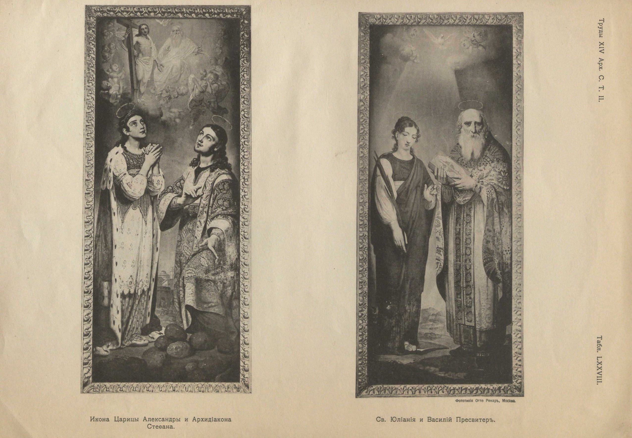С боков иконостаса, по сторонам устоев триумфальной арки, помещены две остальных местных иконы1), изображающие Св. Царицу Александру и архидиакона Стефана и Св. Юлианию и Св. муч. Василия пресвитера (табл. LXXVIII). Обе иконы, заключающие по два изображения Святых, не имеющих прямого отношения друг к другу, очевидно изображают патронов семейства храмоздателя. Изумительная выписка фигур до мелочей, замечательные позы и выражение, при высоком художественном исполнении и чудной гармонии красок, выдвигают эти иконы на первое место. Особенно возбуждает высокий художественный интерес икона левого устоя арки. Лица Св. Царицы Александры и архидиакона Стефана дышат, чистой, не земной красотой и убежденной светлой верой. Мир света, радости, покоя снисшел на них! Глаза их с кроткою любовью и глубокой верой устремлены вверх, где высоко, в отверстом небе, виднеется «Отечество» среди сонма Серафимов. Вдали, на горизонте, виден храм, а внизу, в ногах архидиакона — камни. Сила и свежесть красок этой чудной иконы невероятны, а фигурам придан до иллюзии сильный рельеф.