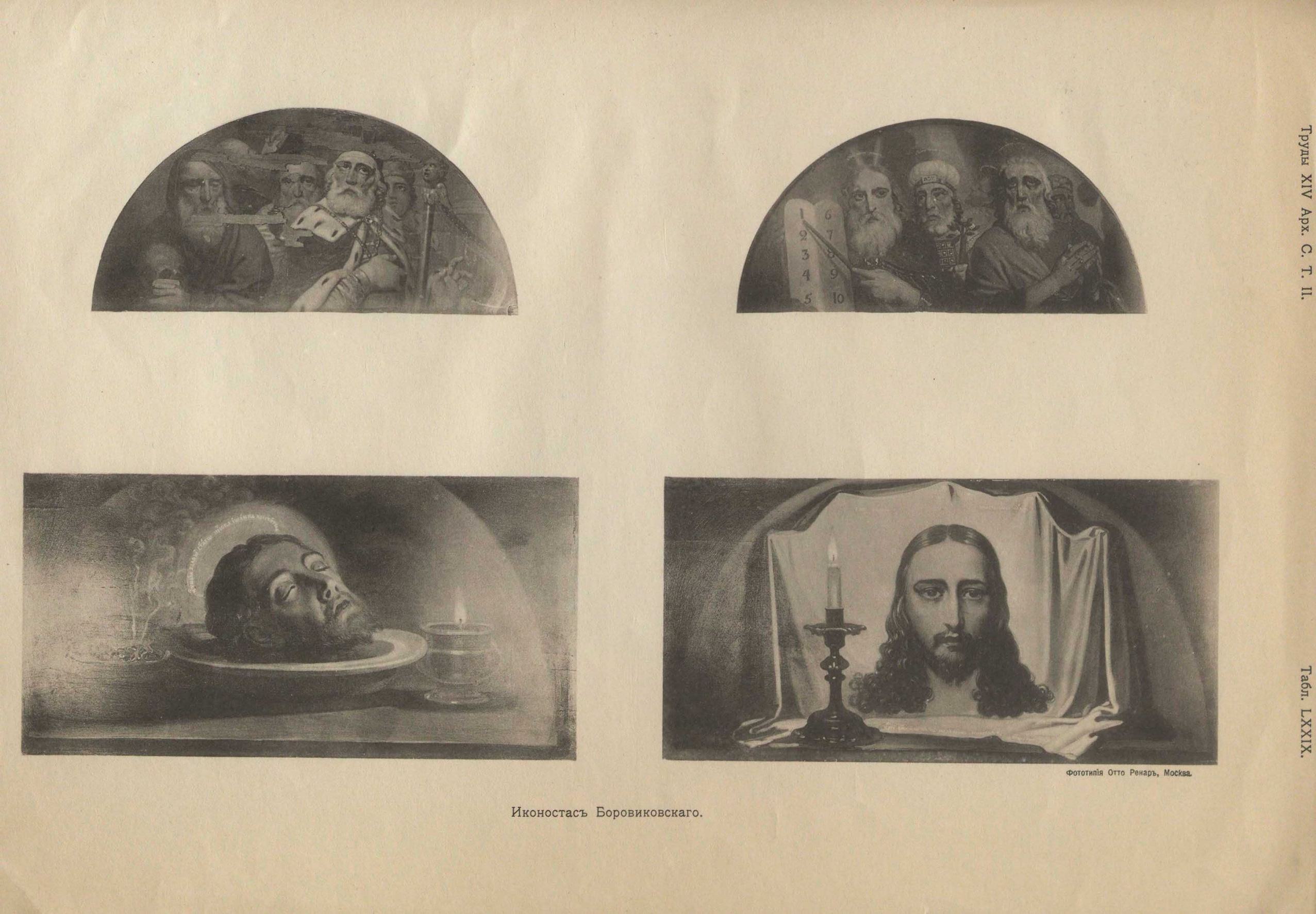Сверх северных и южных дверей помещены оригинальные изображения «Нерукотвореннаго Спаса» и «Усекновенной главы св. Иоанна Предтечи» (табл. LXXIX). Их необыкновенная реальность и выписка до степени рельефа оригинально сочетаются с глубоким мистическим оттенком, придаваемым им аксессуарами. Особенно отличается этим голова Предтечи, освещаемая лампадой и окутанная дымкой фимиама. И что-то необыкновенное придает «Нерукотворенному Спасу» до иллюзии выписанная горящая свеча. Сонмы пророков помещенные в полукругах над иконами Спасителя и Богоматери, прелестны в красочной гармонии цветов (табл. LXXIX). Их вдохновенные выразительные лица, к сожалению, чрезвычайно попорчены; левая икона, над Богоматерью, почти разрушена совсем.