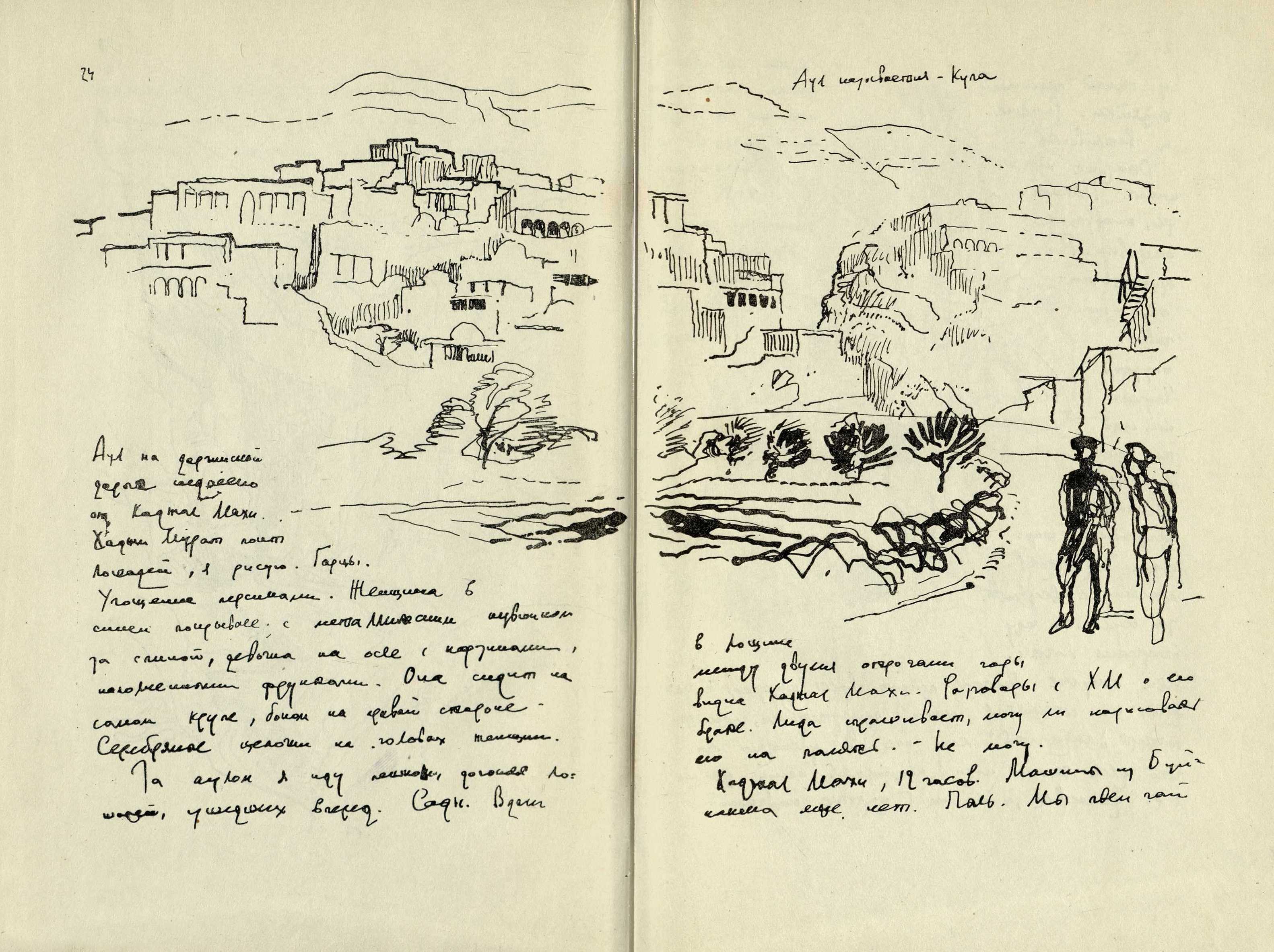 Но самое замечательное, что вывез из командировок художник, — это «Дневники». Их два тома, они замечательны внутренним содержанием и неотделимой от него формой. Две тетради в простом холщевом переплете. В них четыреста страниц, покрытых текстом и рисунками. Текст и рисунки неразрывно связаны.