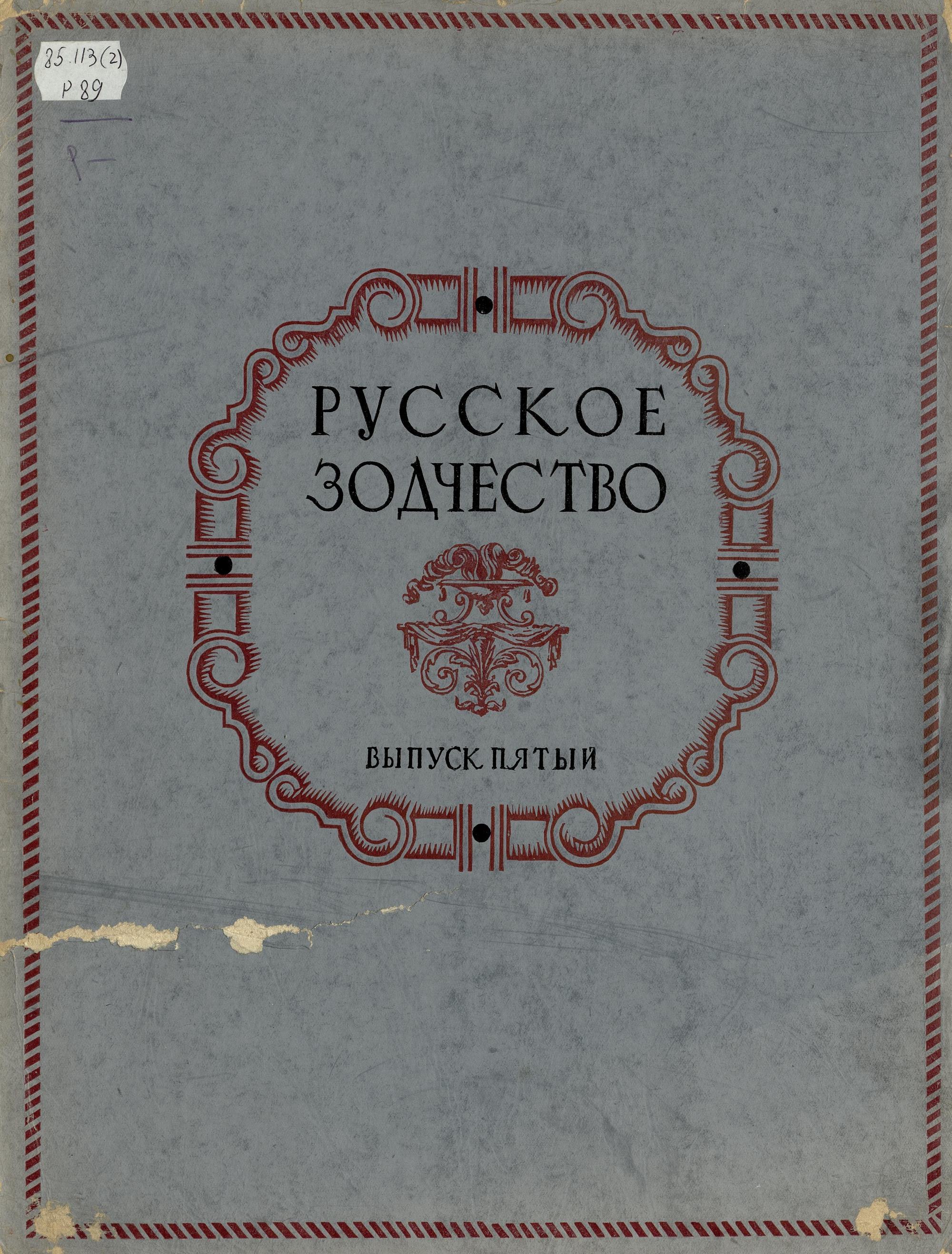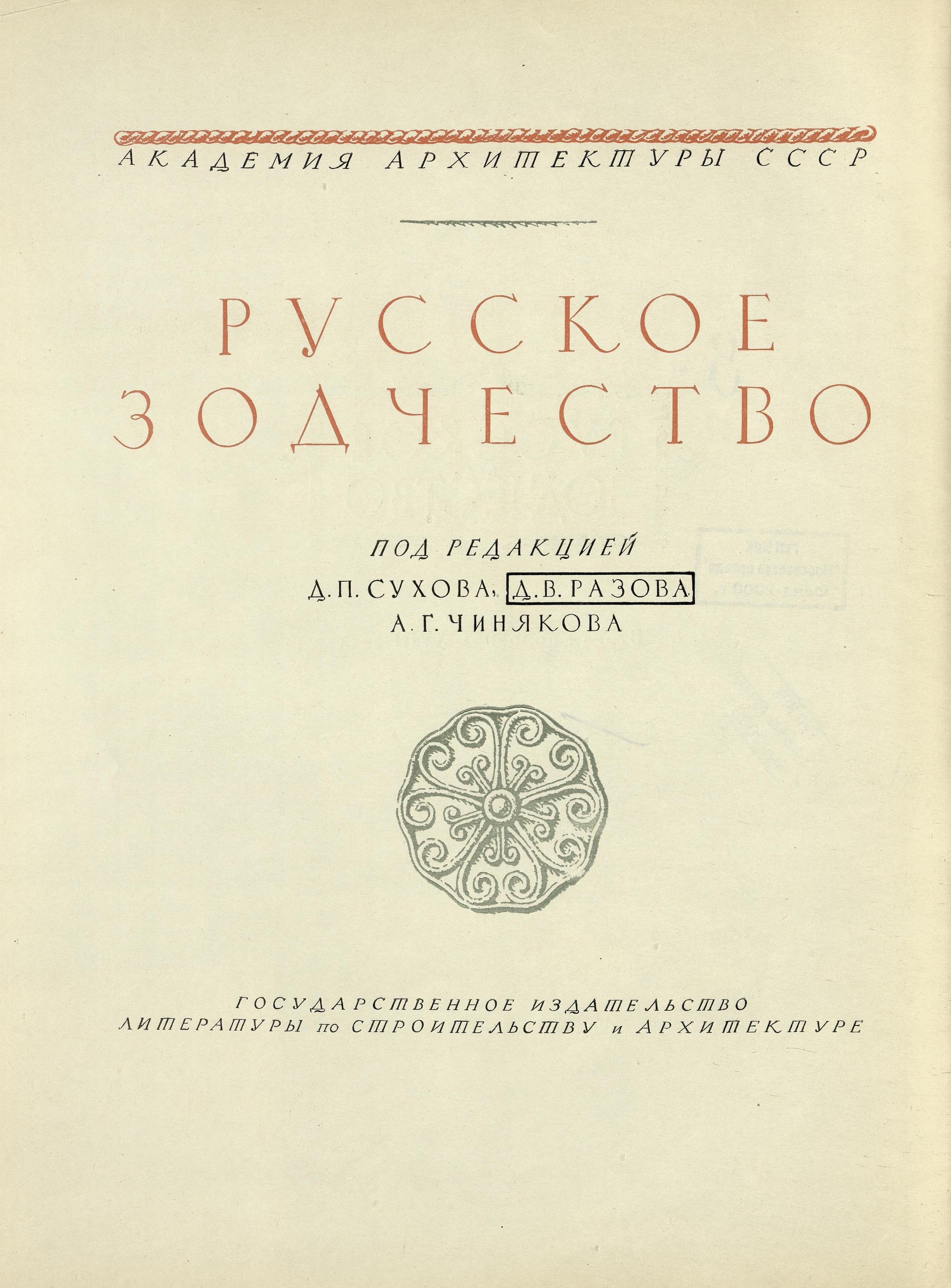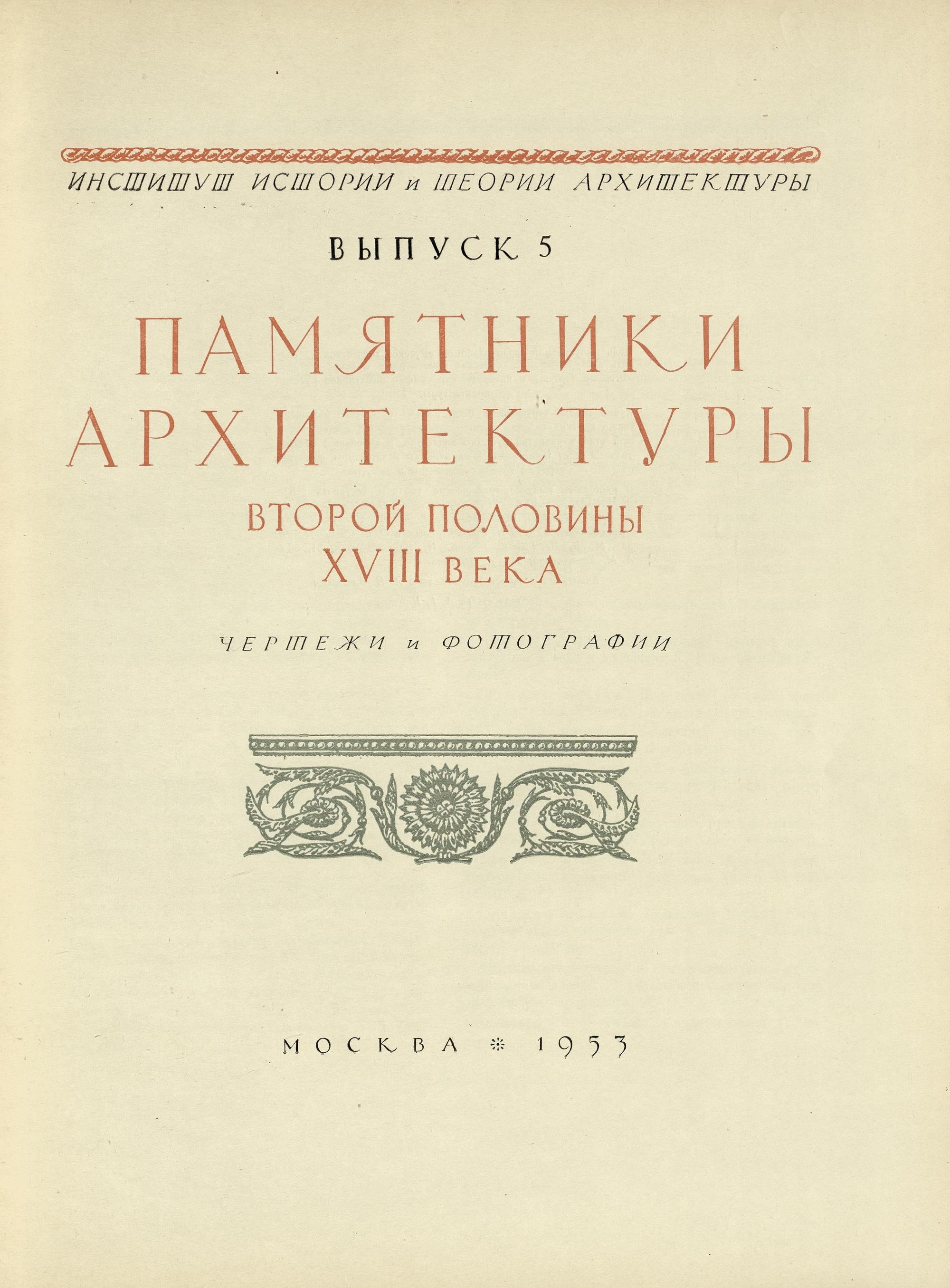 Русское зодчество : Выпуск 5. Памятники архитектуры второй половины XVIII века : Чертежи и фотографии. — Москва, 1953Русское зодчество : Выпуск 5. Памятники архитектуры первой половины XVIII века : Чертежи и фотографии. — Москва : Государственное издательство литературы по строительству и архитектуре, 1953. — 26 с., 45 отд. л. ил. — (Русское зодчество / Под редакцией Д. П. Сухова, Д. В. Разова, А. Г. Чинякова ; Академия архитектуры СССР, Институт истории и теории архитектуры).[Аннотация]