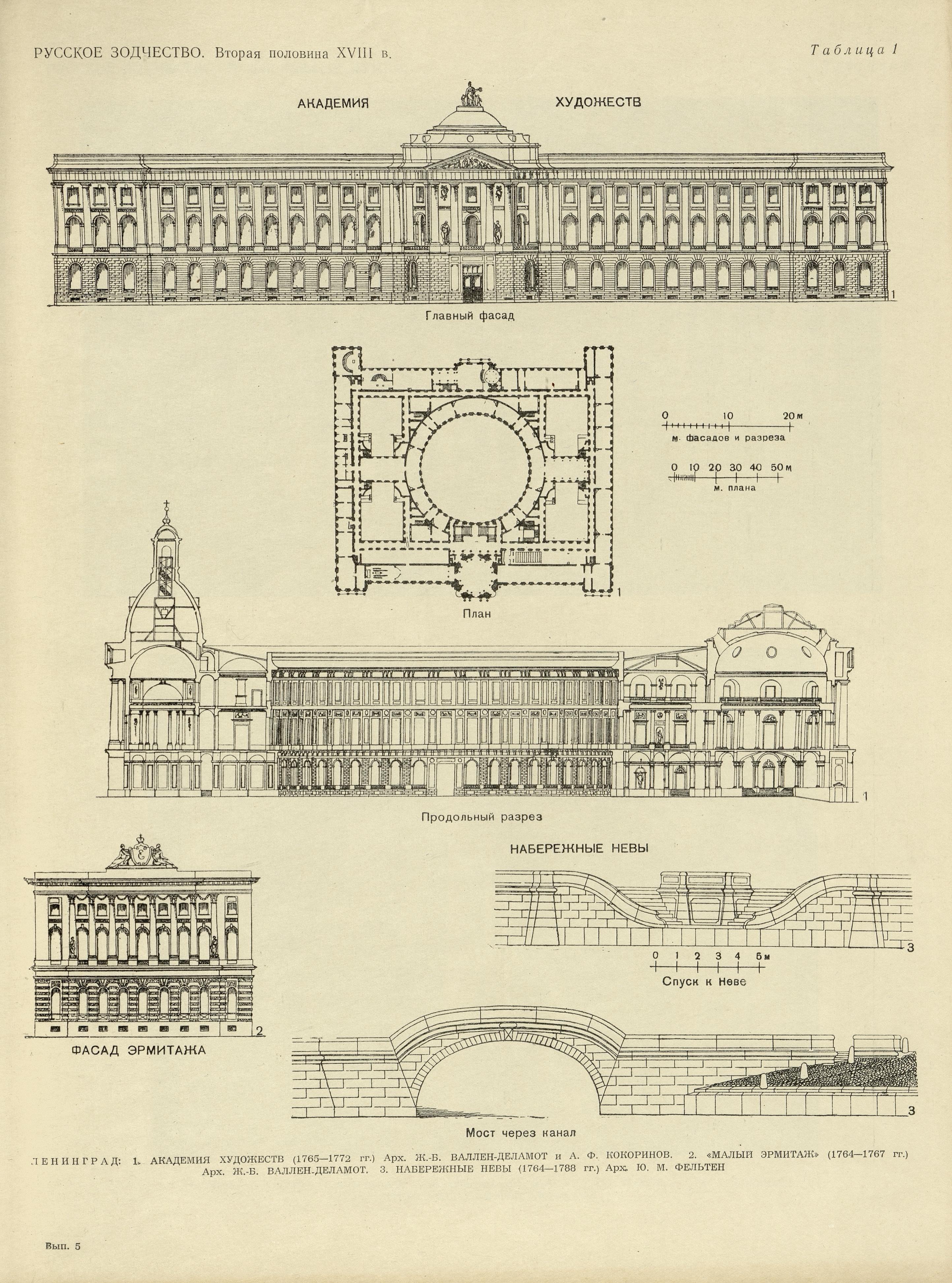 Таблица 1*. Ленинград: 1. Академия художеств (1765—1772 гг.) Архитекторы Ж. Б. Валлен-Деламот и А. Ф. Кокоринов. 2. «Малый Эрмитаж» (1764—1767 гг.). Архитектор Ж- Б. Валлен-Деламот. 3. Набережные Невы (1764—1788 гг.). Архитектор Ю. М. Фельтен