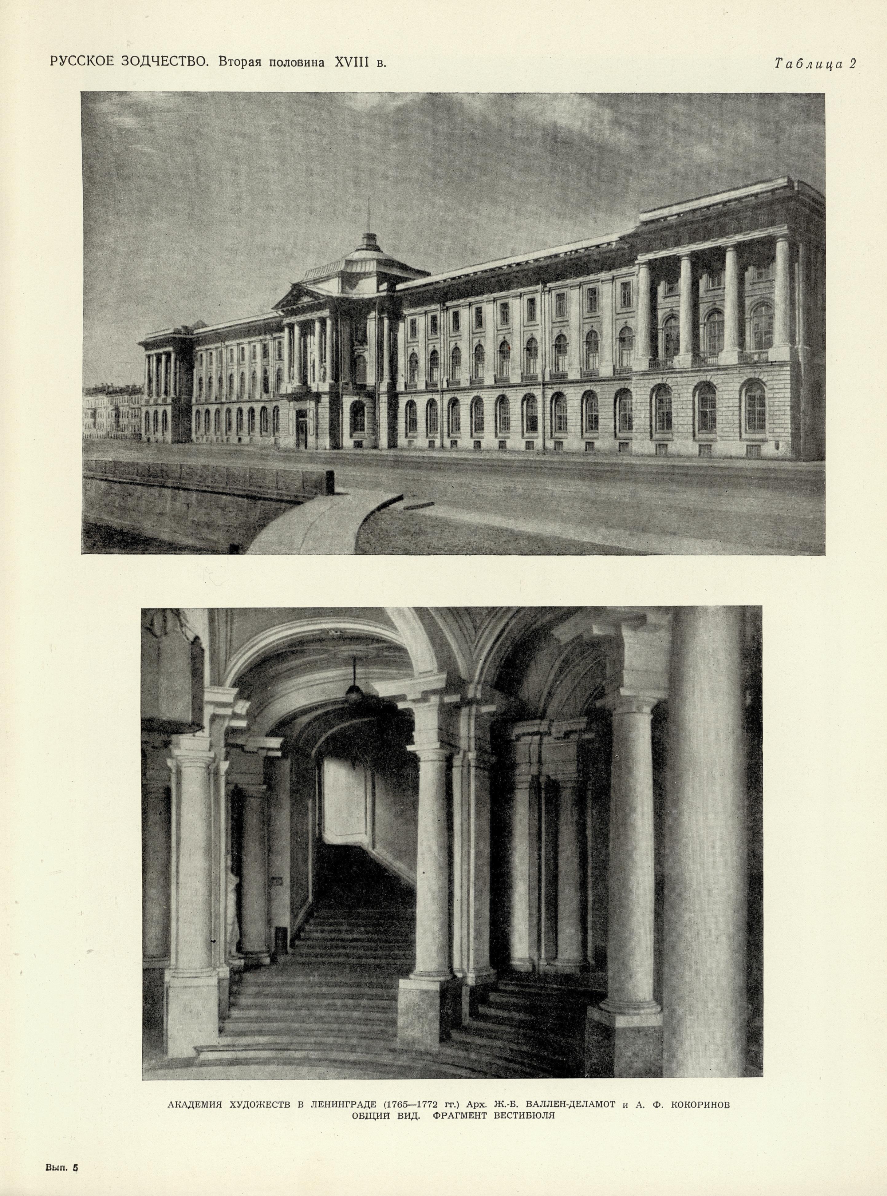 Таблица 2. Академия художеств в Ленинграде (1765—1772 гг.). Архитекторы Ж. Б. Валлен-Деламот и А. Ф. Кокоринов. 1. Общий вид. 2. Фрагмент вестибюля (МРА)