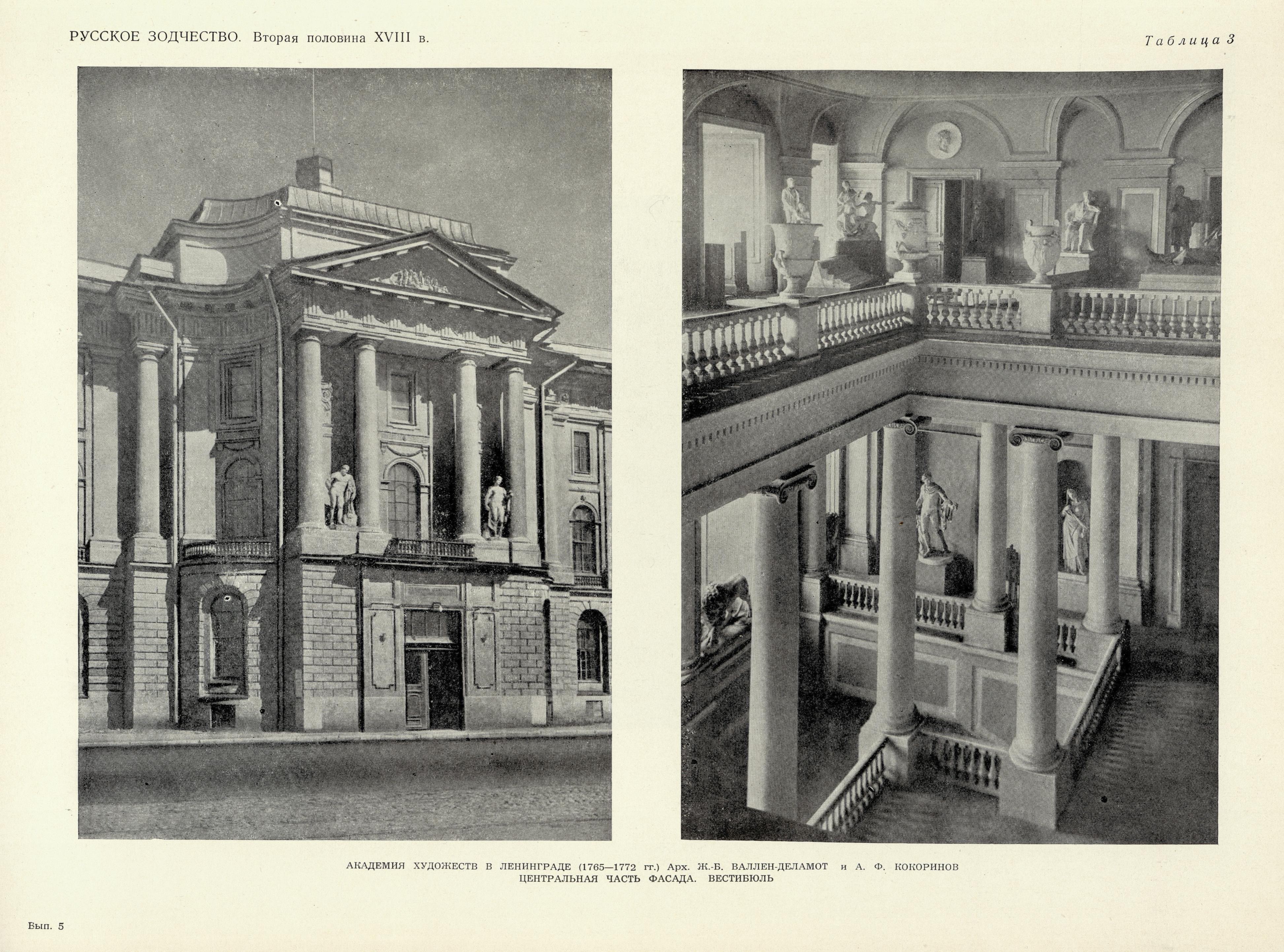 Таблица 3. Академия художеств в Ленинграде (1765—1772 гг.). Архитекторы Ж. Б. Валлен-Деламот и А. Ф. Кокоринов. 1. Центральная часть фасада. 2. Верхний вестибюль (МРА)