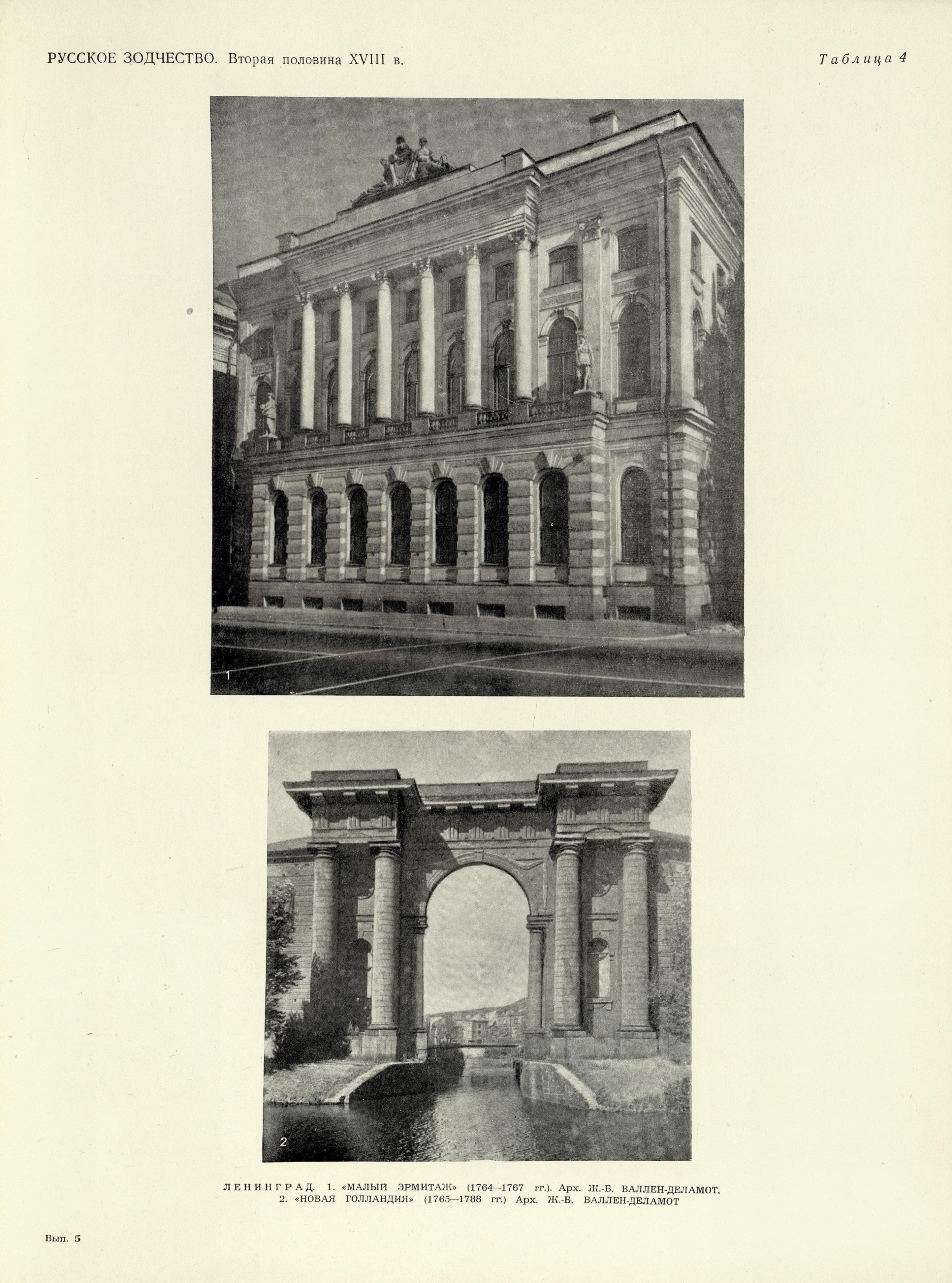 Таблица 4. Ленинград: 1. «Малый Эрмитаж» (1764—1767 гг.). Архитектор Ж. Б. Валлен-Деламот. Общий вид (МРА). 2. «Новая Голландия» (1765—1788 гг.). Архитектор Ж. Б. Валлен-Деламот. Арка (МРА)