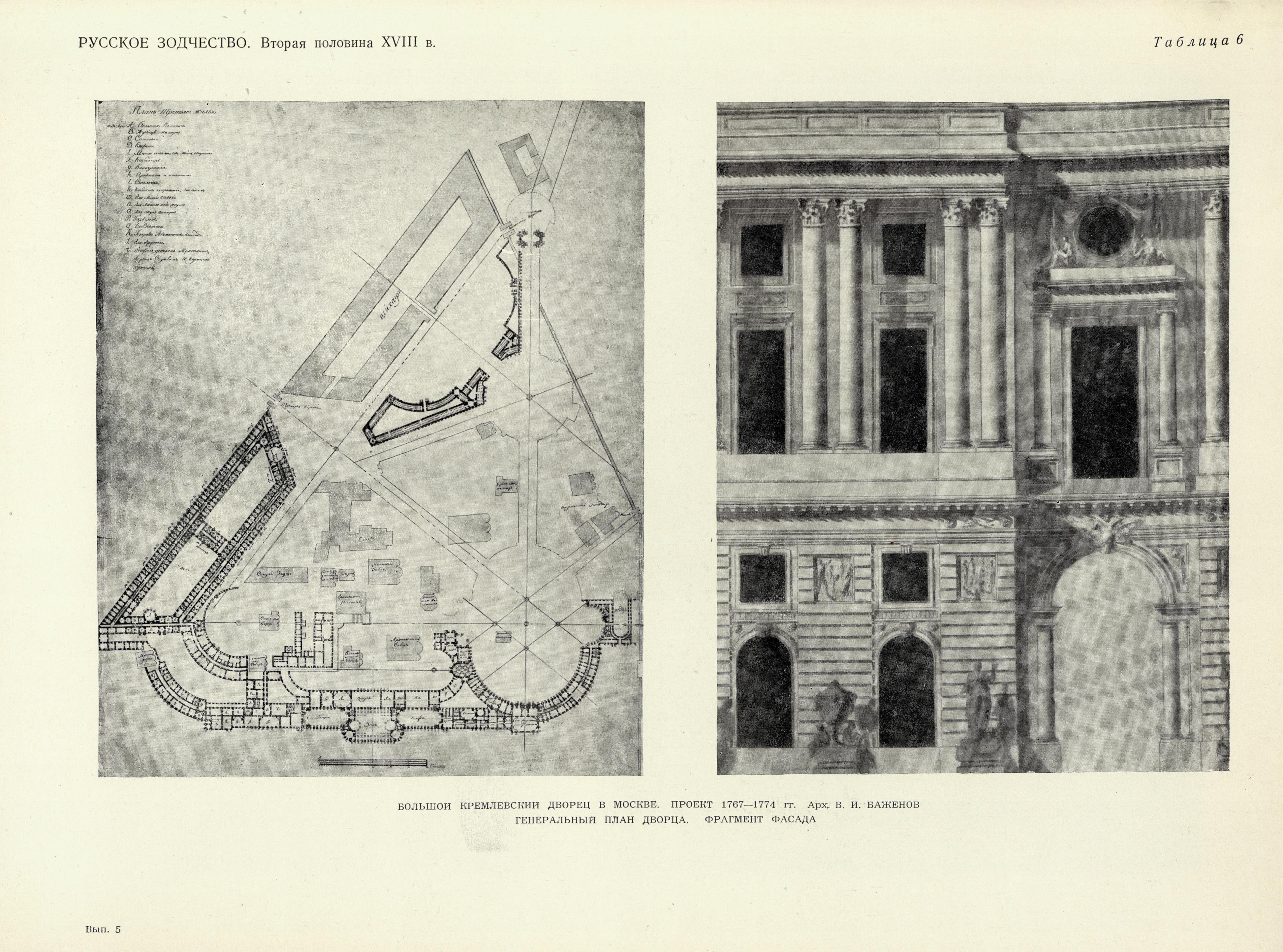Таблица 6. Большой Кремлевский дворец в Москве. Проект (1767—1774 гг.). Архитектор В. И. Баженов. 1. Фрагмент фасада (МАА). 2. Генеральный план дворца (ГИМ)