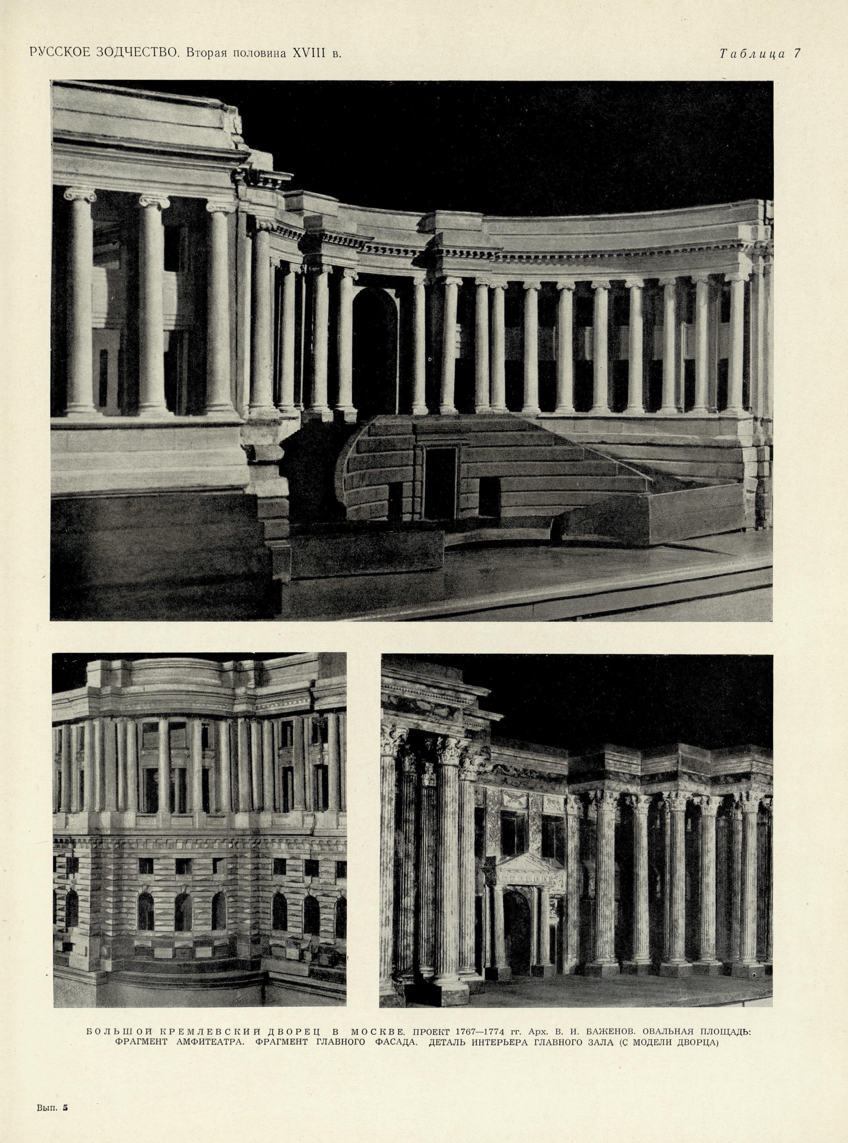 Таблица 7. Большой Кремлевский дворец в Москве. Модель (1769—1773 гг.). Архитектор В. И. Баженов. 1. Овальная площадь: фрагмент амфитеатра. 2. Фрагмент главного фасада. 3. Деталь интерьера главного зала (МАА)