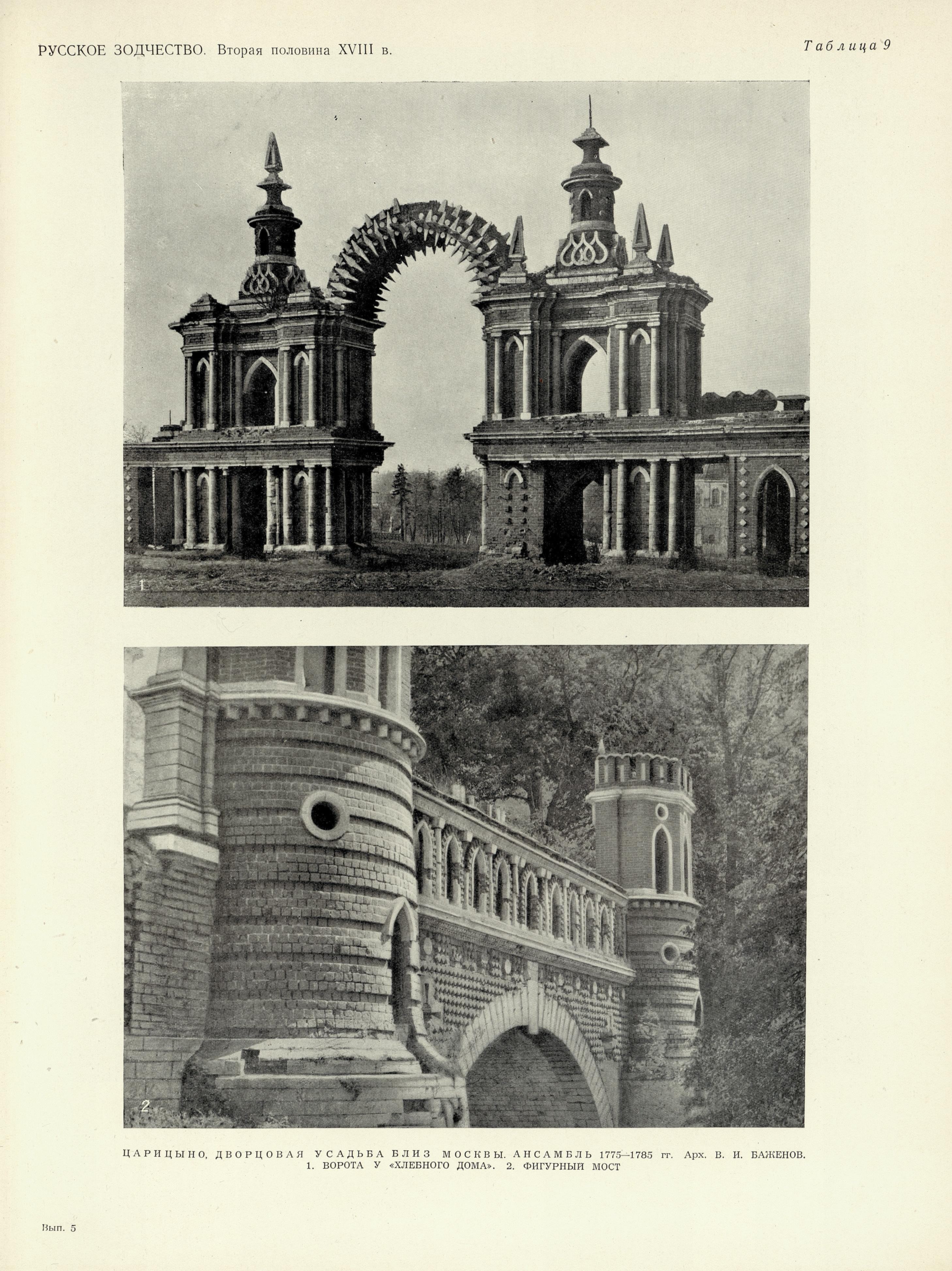 Таблица 9. Царицыно, дворцовая усадьба близ Москвы. Ансамбль 1775—1785 гг. Архитектор В. И. Баженов. 1. Ворота у Хлебного дома (МАА). 2. Фигурный мост (МАА)