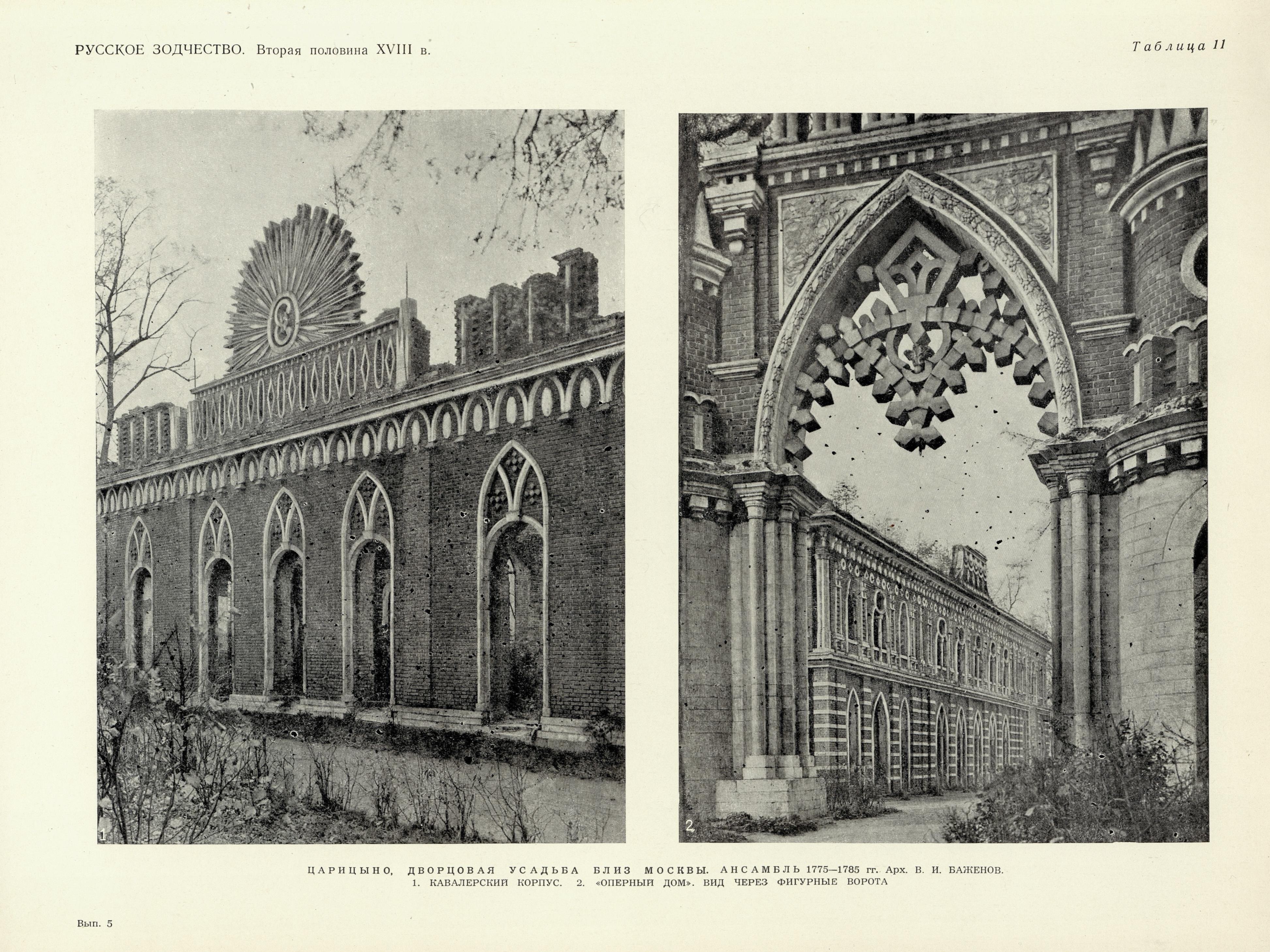 Таблица 11. Царицыно, дворцовая усадьба близ Москвы. Ансамбль 1775—1785 гг. Архитектор В. И. Баженов. 1. Кавалерский корпус (ИИТ). 2. Опервый дом: вид через Фигурные ворота (ИИТ)
