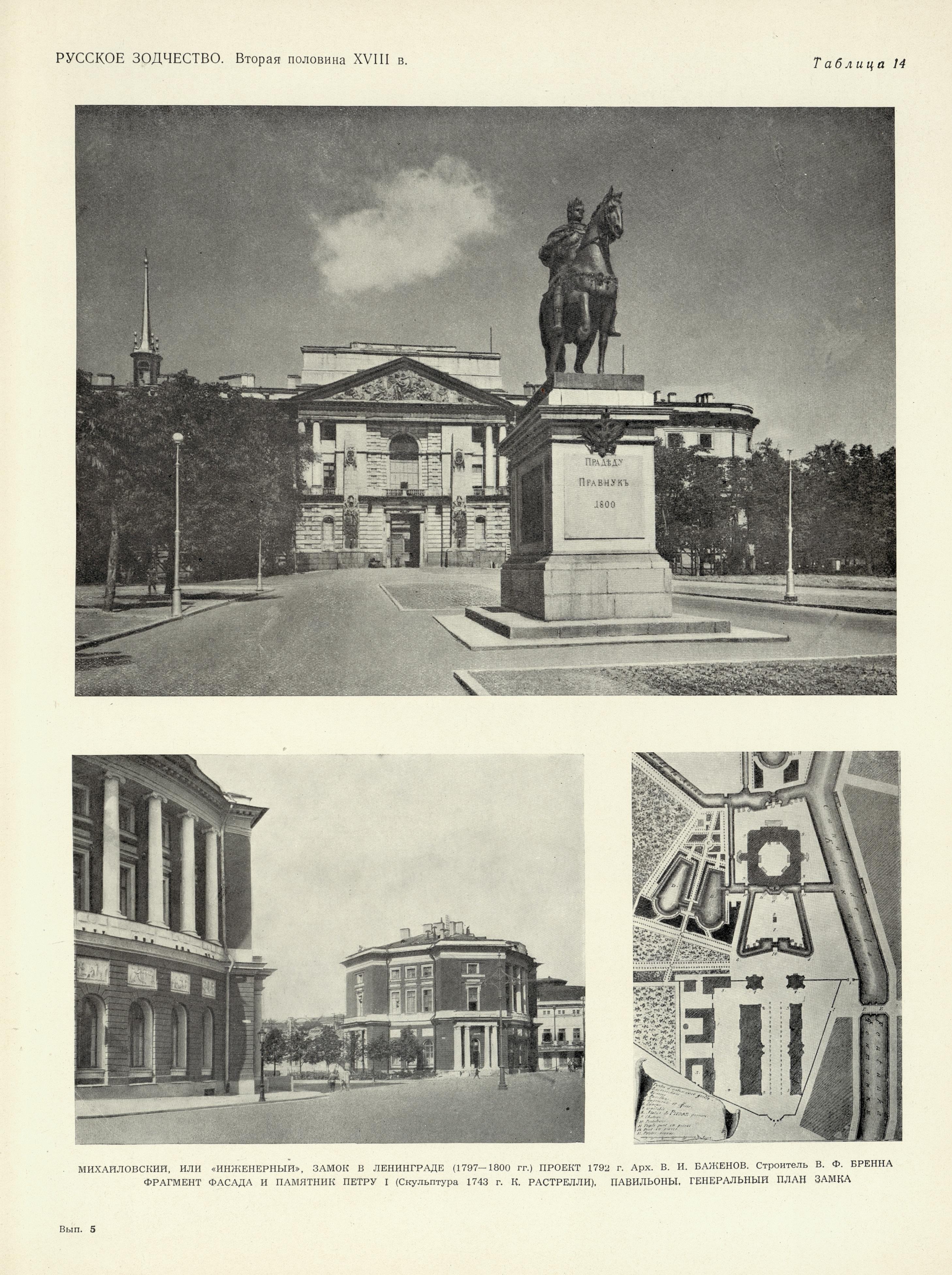 Таблица 14. Михайловский, или «Инженерный», замок в Ленинграде (1797—1800 гг.; проект 1792 г.). Архитектор В. И. Баженов. Строитель В. Ф. Бренна. 1. Фрагмент фасада и памятник Петру 1; скульптура 1743 г. К. Растрелли. 2. Генеральный план замка. 3. Павильоны (МРА)