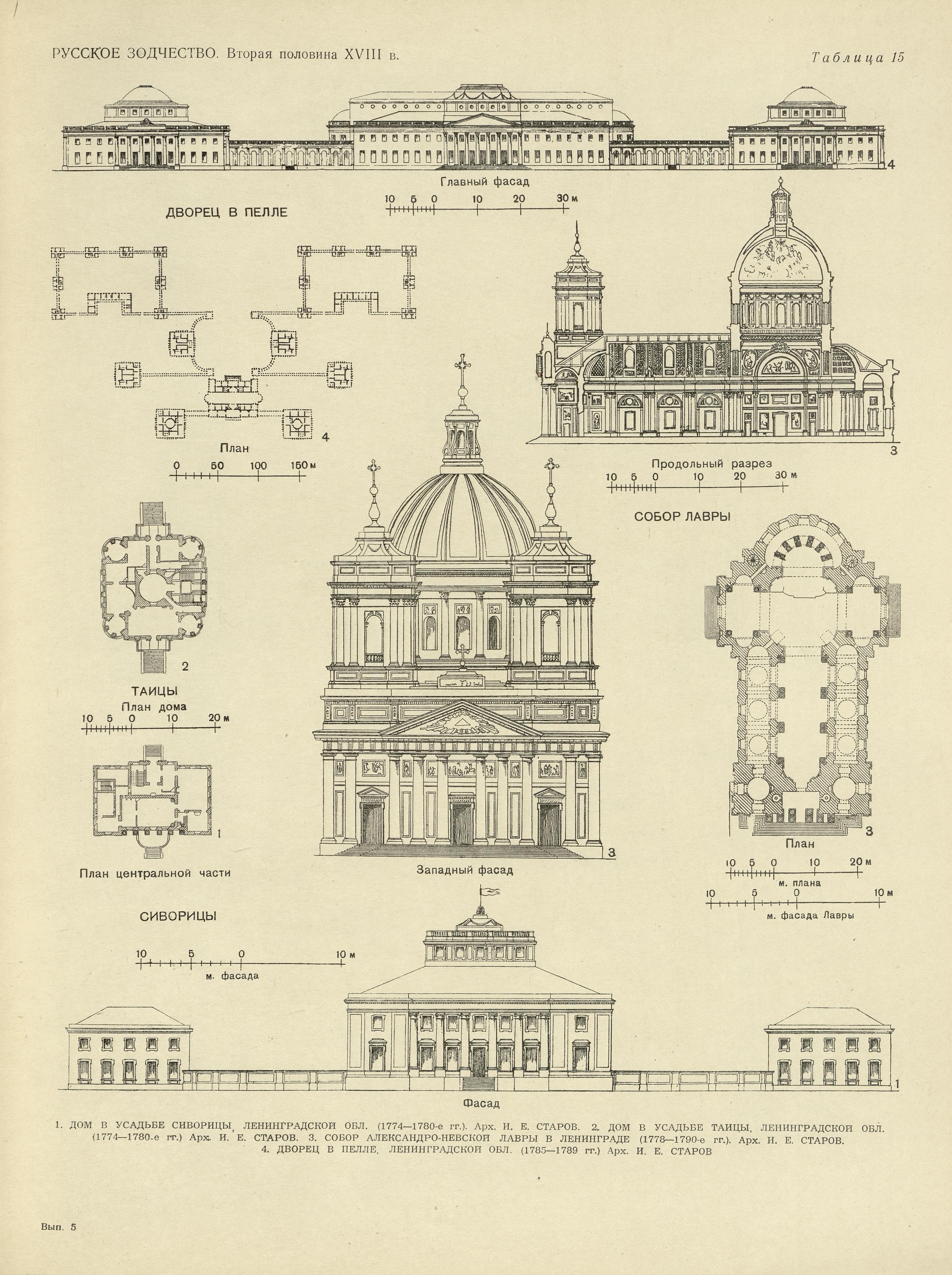 Таблица 15*. 1. Дом в усадьбе Сиворицы, Ленинградской области (1774—1780-е гг.). Архитектор И. Е. Старов. 2. Дом в усадьбе Таицы, Ленинградской области (1774—1780 гг.). Архитектор И. Е. Старов. 3. Собор Александро-Невской лавры в Ленинграде (1778—1790 гг.). Архитектор И. Е. Старов. 4. Дворец в Пелле, Ленинградской области (1785—1789 гг.). Архитектор И. Е. Старов