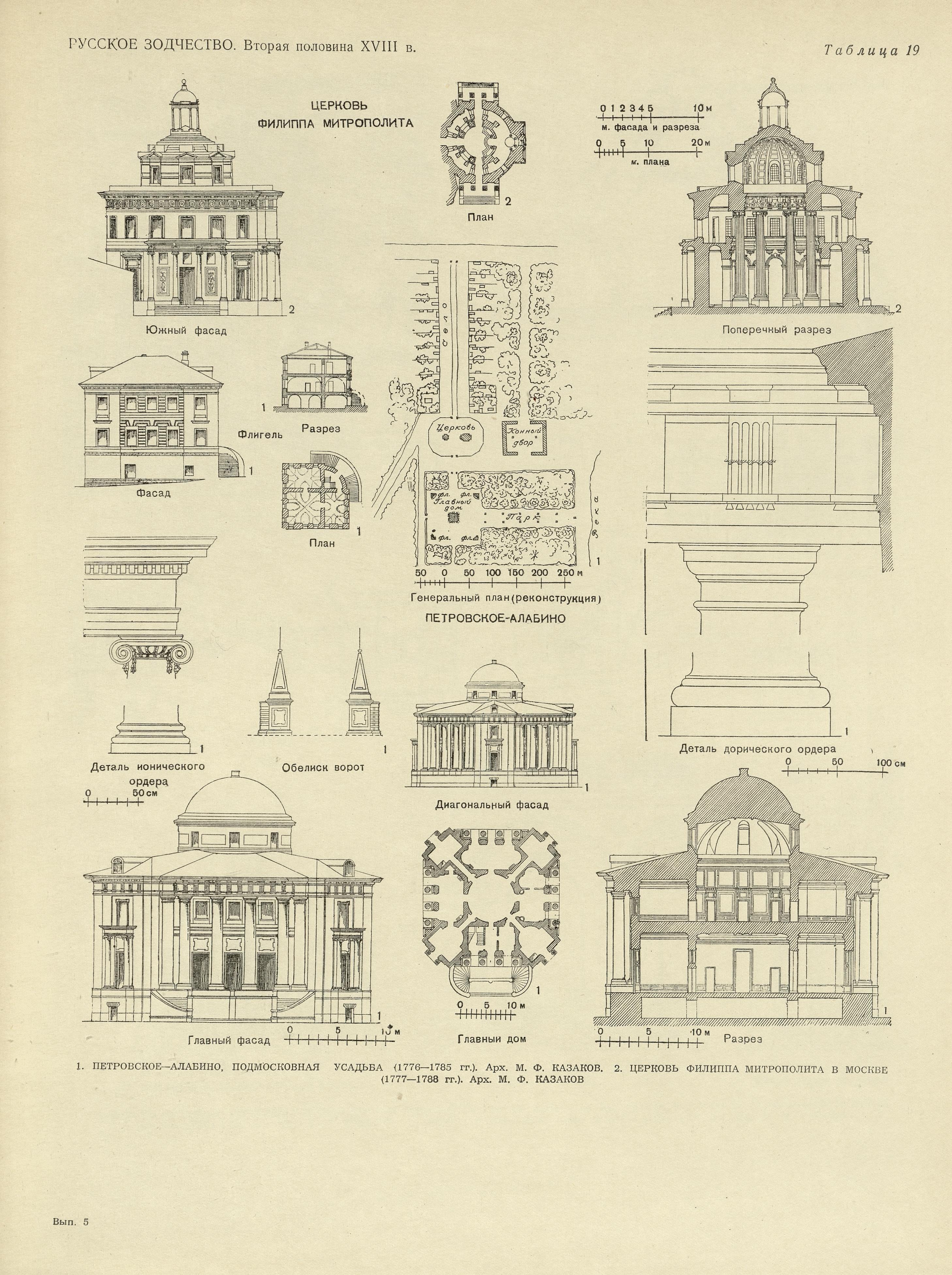 Таблица 19*. 1. Петровское-Алабино, подмосковная усадьба (1776—1785 гг.). Архитектор М. Ф. Казаков. 2. Церковь Филиппа митрополита в Москве (1777—1788 гг.). Архитектор М. Ф. Казаков