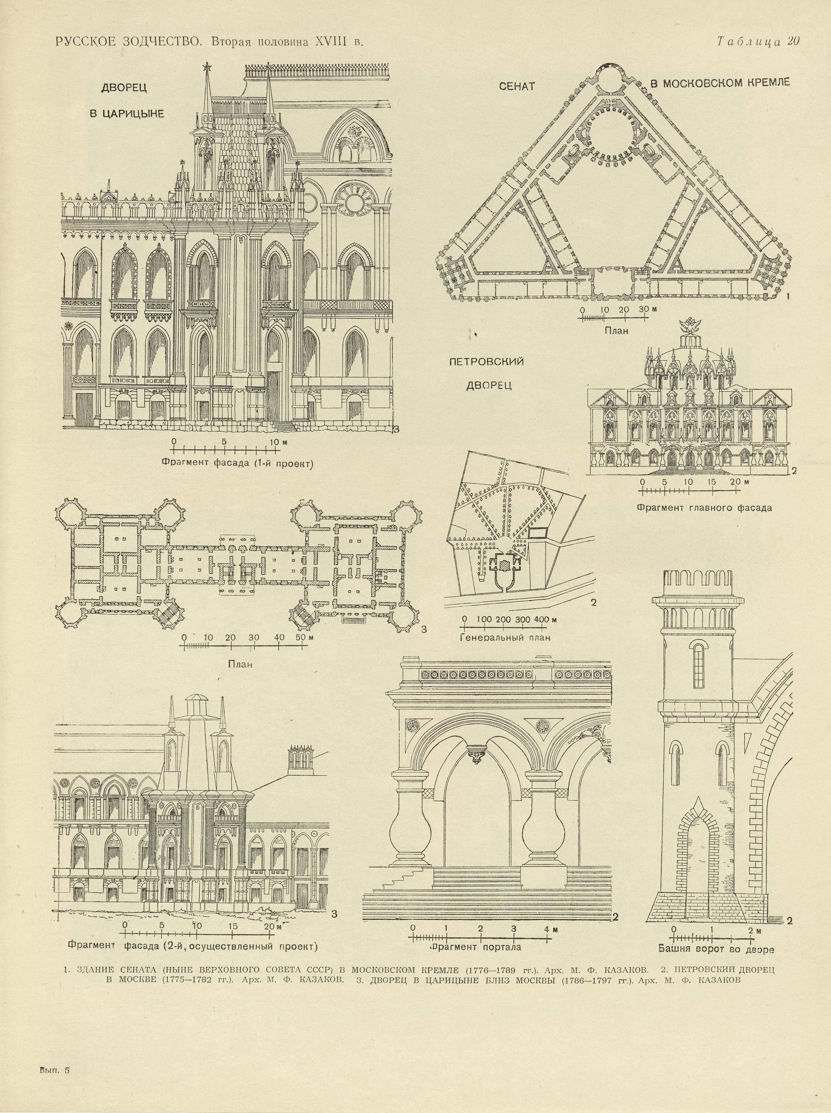 Таблица 20*. 1. Здание Сената (ныне Верховного Совета СССР) в Московском Кремле (1776—1789 гг.). Архитектор М. Ф. Казаков. 2. Петровский дворец в Москве (1775—1782 гг.). Архитектор М. Ф. Казаков. 3. Дворец в Царицыне, близ Москвы (1786—1797 гг.). Архитектор М. Ф. Казаков