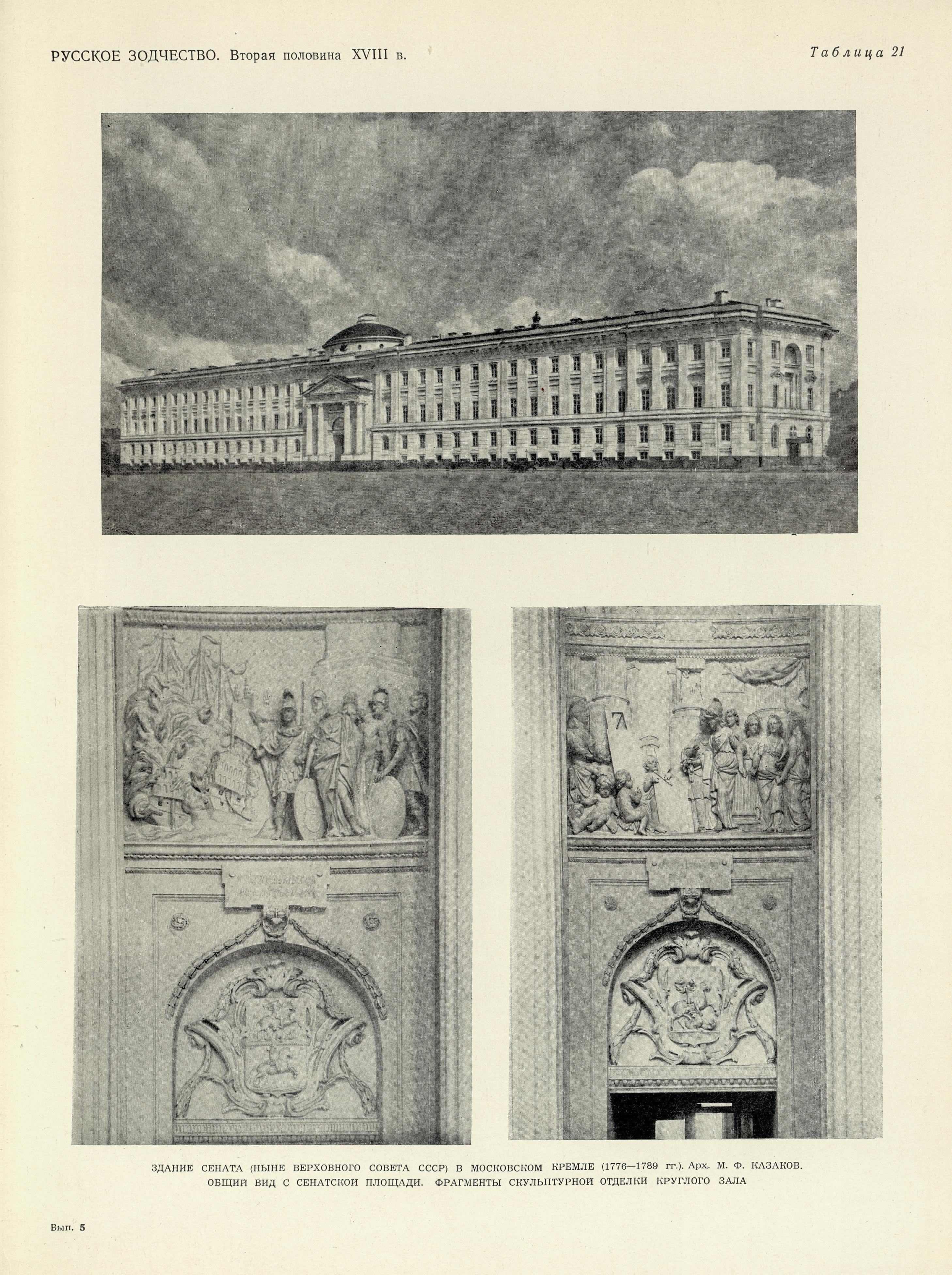 Таблица 21. Здание Сената (ныне Верховного Совета СССР) в Московском Кремле (1776—1789 гг.). Архитектор М. Ф. Казаков. 1. Вид с Сенатской площади. 2—3. Интерьер: скульптурная отделка круглого зала (МАА)