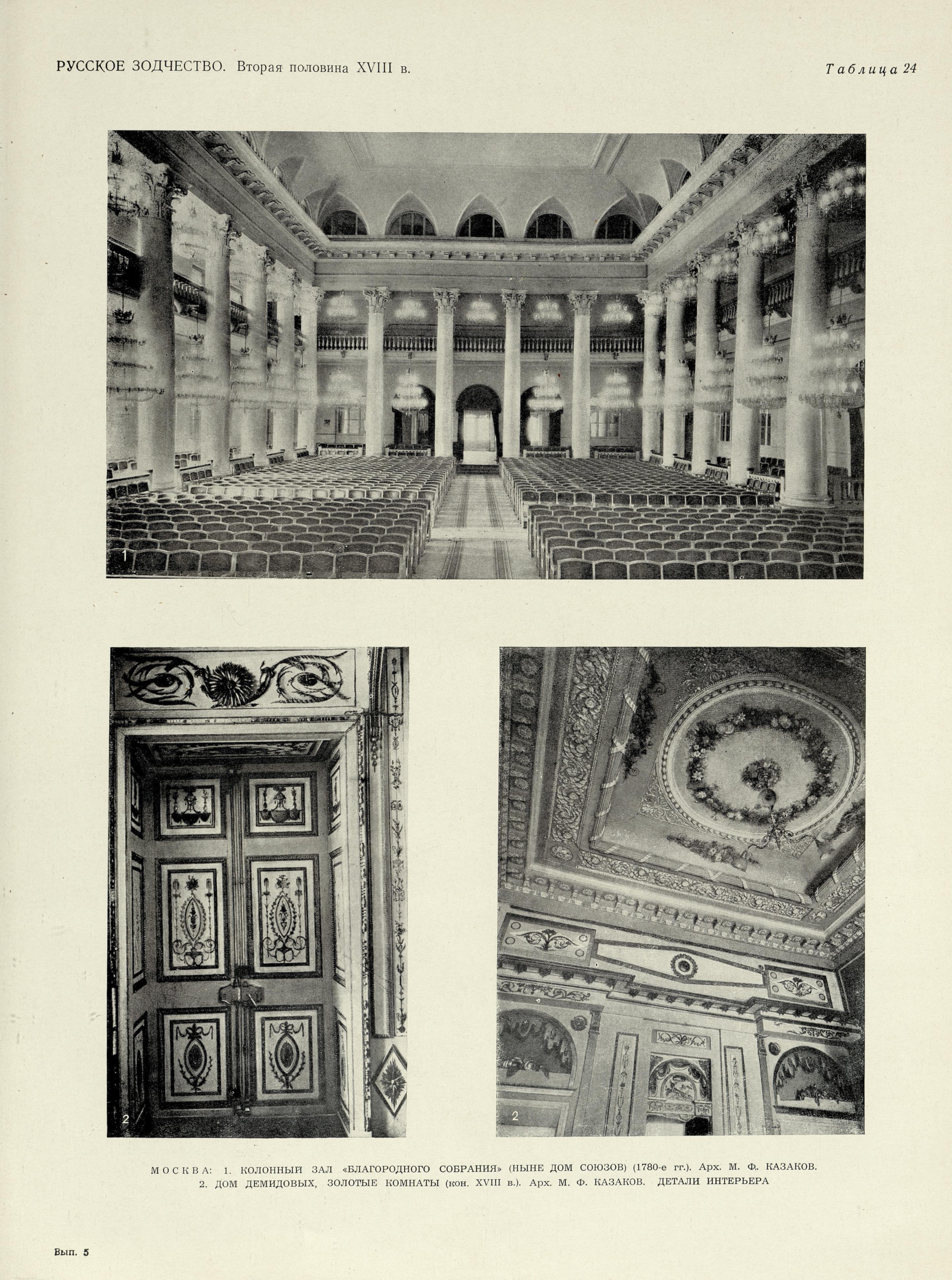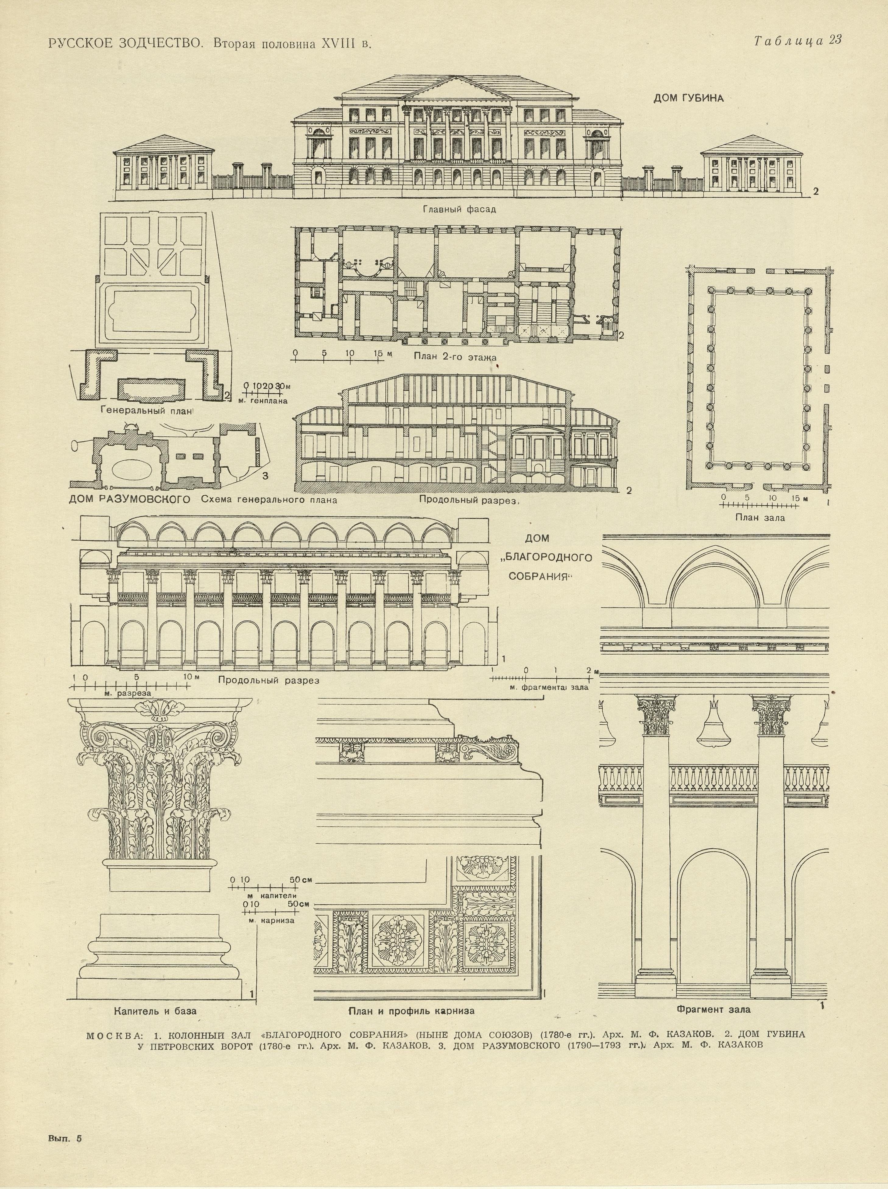 Таблица 23*. Москва: 1. Колонный зал «Благородного собрания» (ныне Дома Союзов) (1780-е гг.). Архитектор М. Ф. Казаков. 2. Дом Губина у Петровских ворот (1780-е гг.). Архитектор М. Ф. Казаков. 3. Дом Разумовского (1790—1793 гг.). Архитектор М. Ф. Казаков