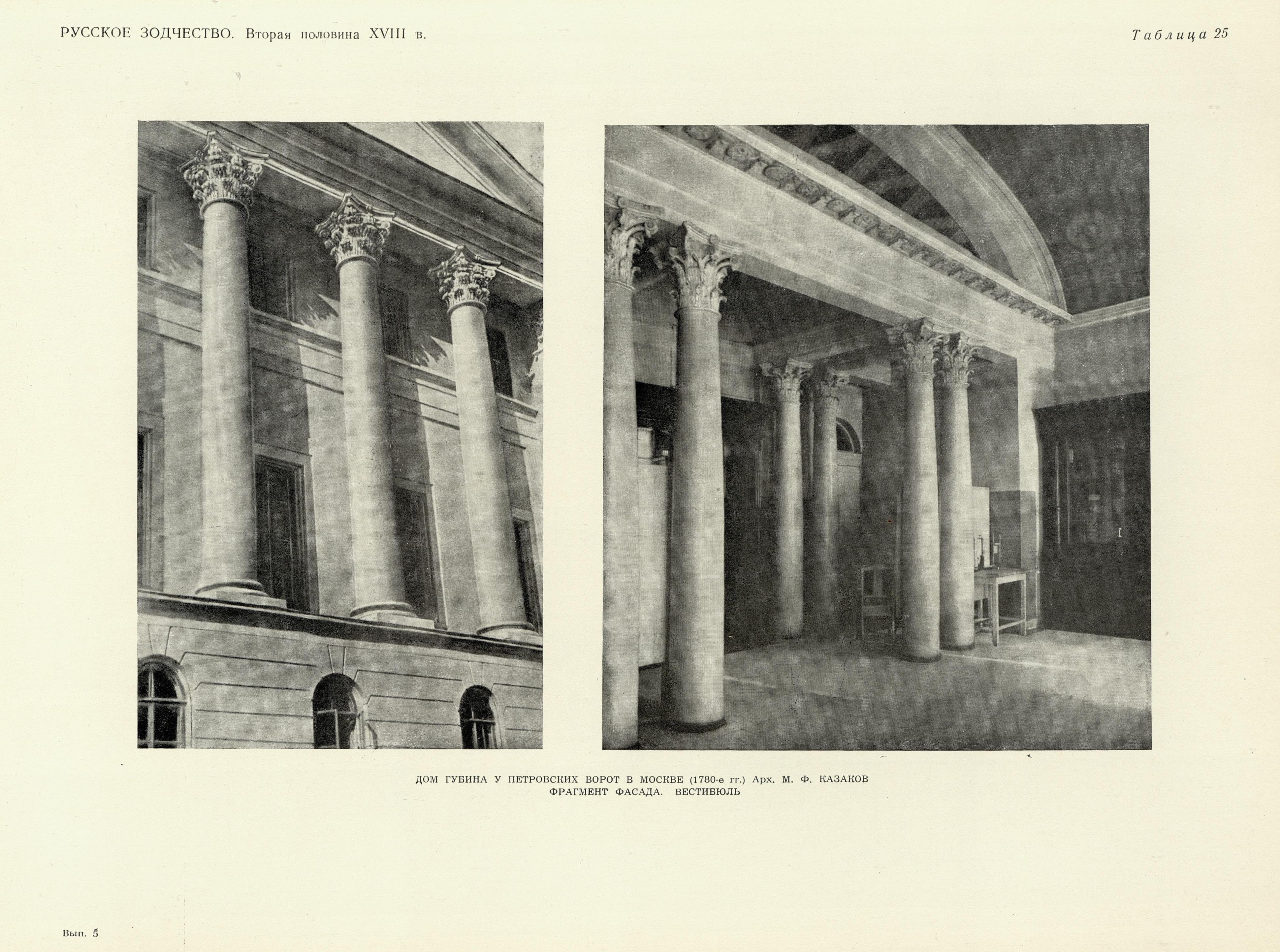 Таблица 25. Дом Губина у Петровских ворот в Москве (1780-е гг.). Архитектор М. Ф. Казаков. Фрагмент фасада и вестибюль (ИИТ)