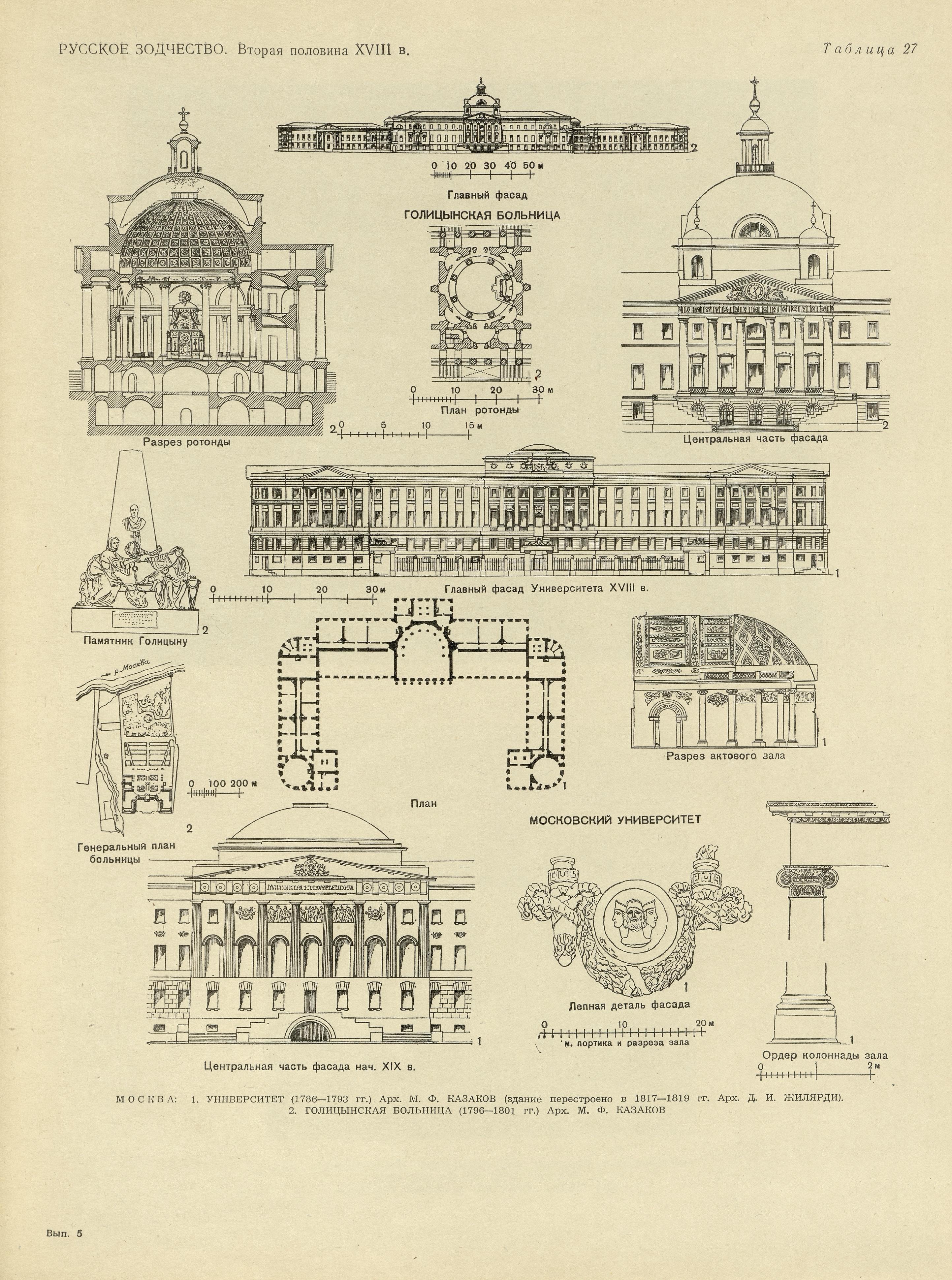Таблица 27*. Москва: 1. Университет (1786—1793 гг.). Архитектор М. Ф. Казаков (перестроен в 1817—1819 гг. архитектором Д. И. Жилярди). 2. Голицынская больница (1796— 1801 гг.). Архитектор М. Ф. Казаков