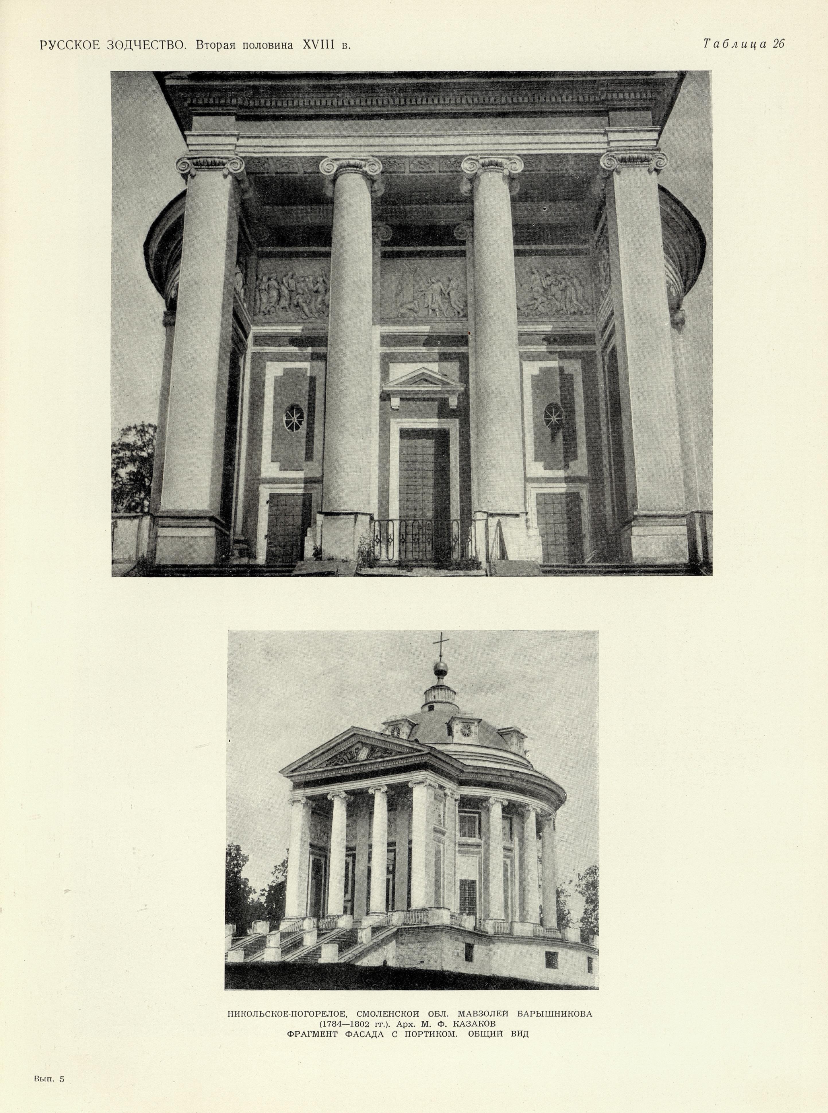 Таблица 26. Мавзолей Барышникова в Никольском-Погорелом Смоленской области (1784—1802 гг.). Архитектор М. Ф. Казаков. 1. Фрагмент фасада с портиком (ИИТ). 2. Общий вид