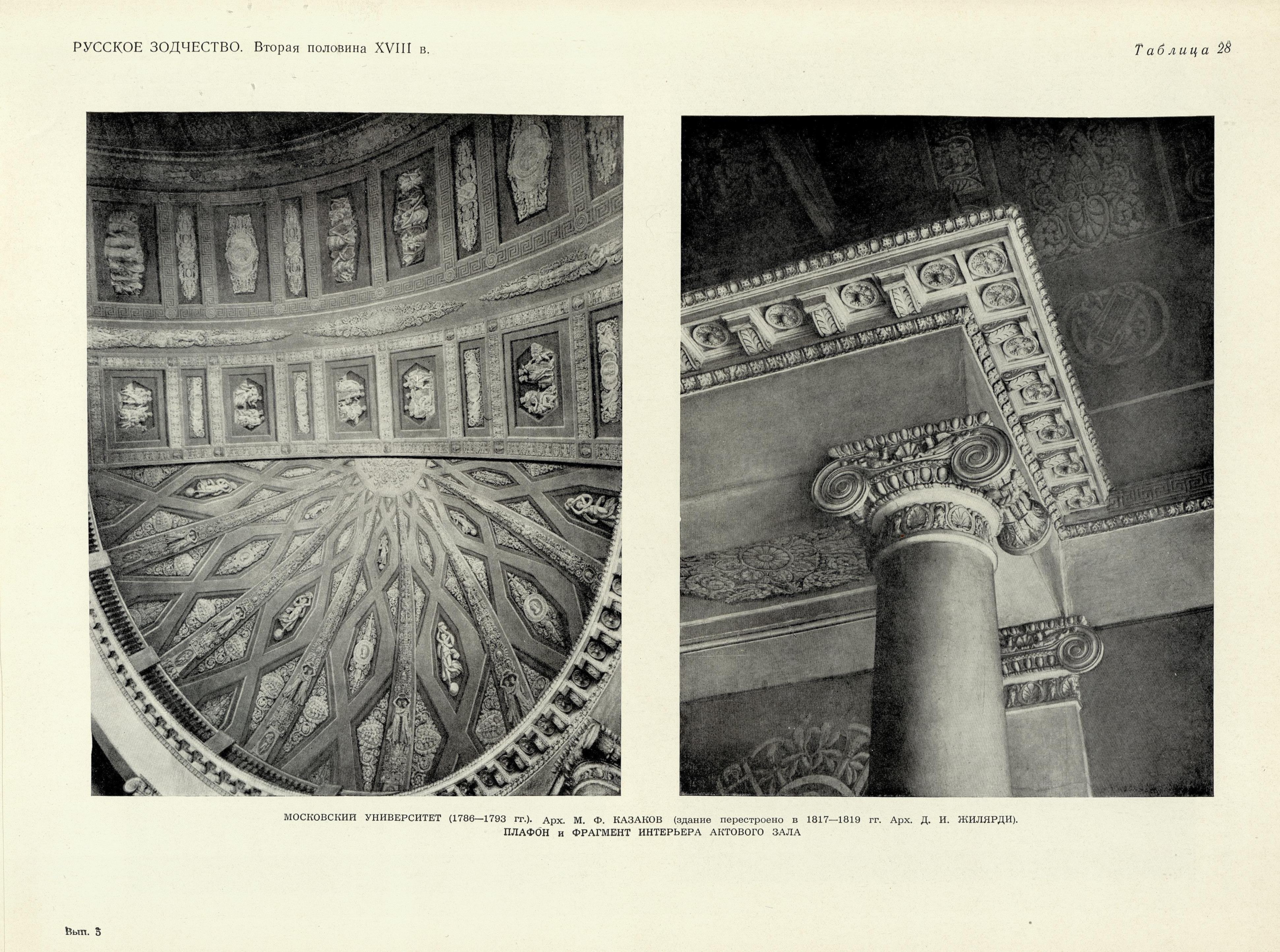 Таблица 28. Московский университет (1786—1793 гг.). Архитектор М. Ф. Казаков (перестроен в 1817—1819 гг. архитектором Д. И. Жилярди). 1. Плафон Актового зала (МАА). 2. Фрагмент интерьера Актового зала со скульптурной отделкой (МАА)