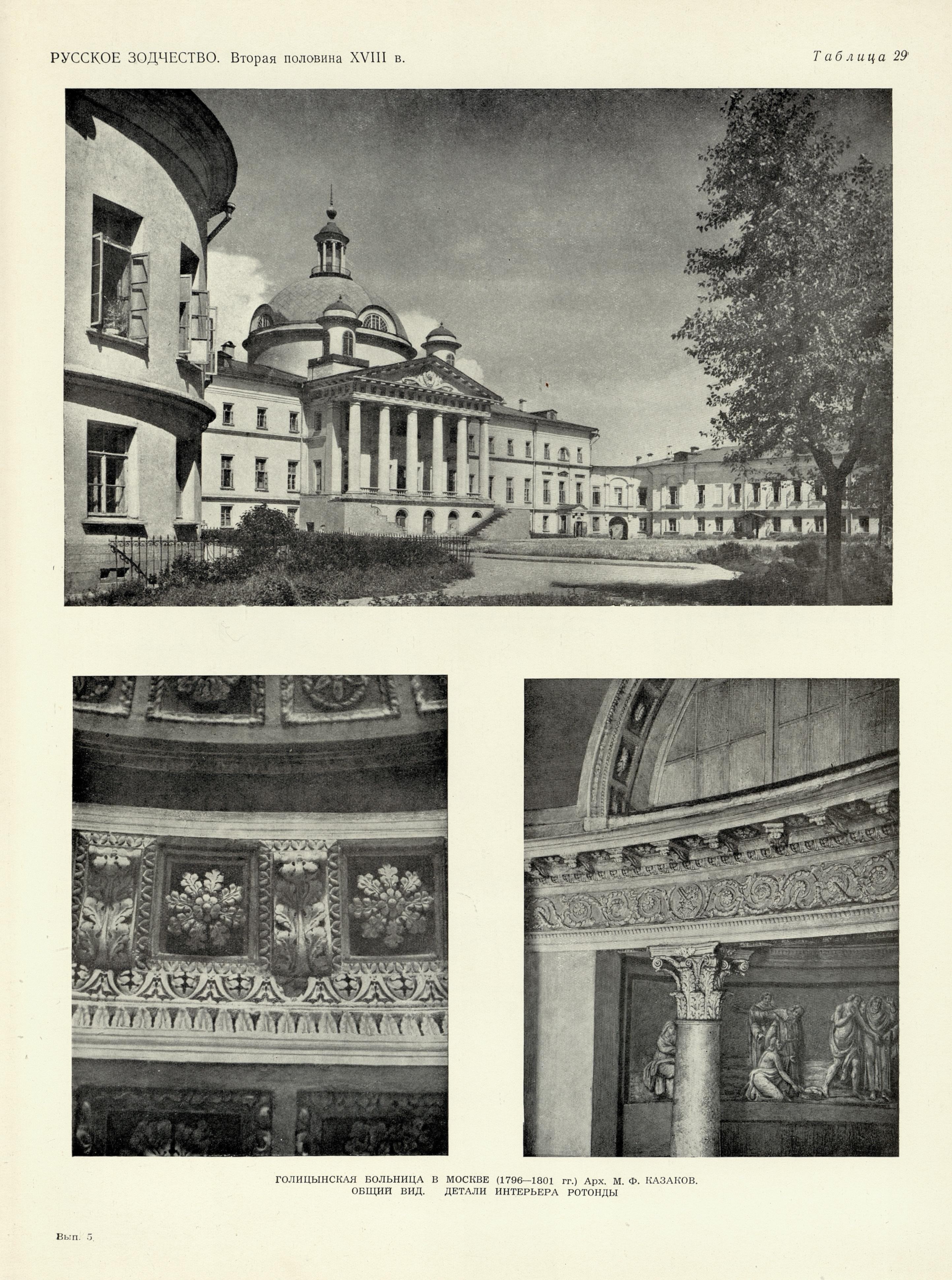 Таблица 29. Голицынская больница в Москве (1796—1801 гг.). Архитектор М. Ф. Казаков. 1. Общий вид (УОП). 2—3. Детали интерьера (МАА)