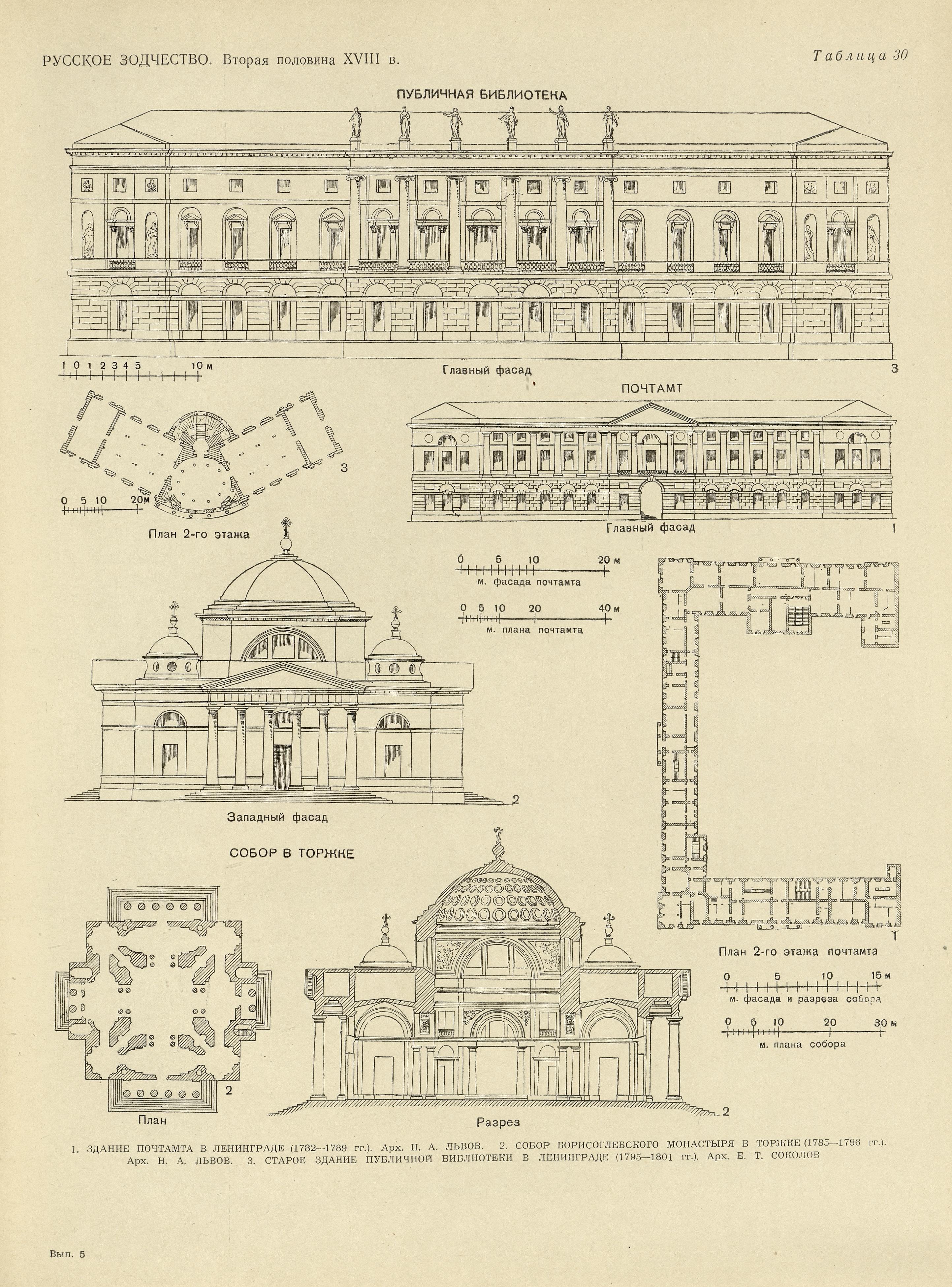 Таблица 30*. Здание почтамта в Ленинграде (1782—1789 гг.). Архитектор Н. А. Львов. 2. Собор Борисоглебского монастыря в Торжке (1785—1796 гг.). Архитектор Н. А. Львов. 3. Старое здание Гос. публичной библиотеки им. Салтыкова-Щедрина в Ленинграде (1795—1801 гг.). Архитектор Е. Т. Соколов
