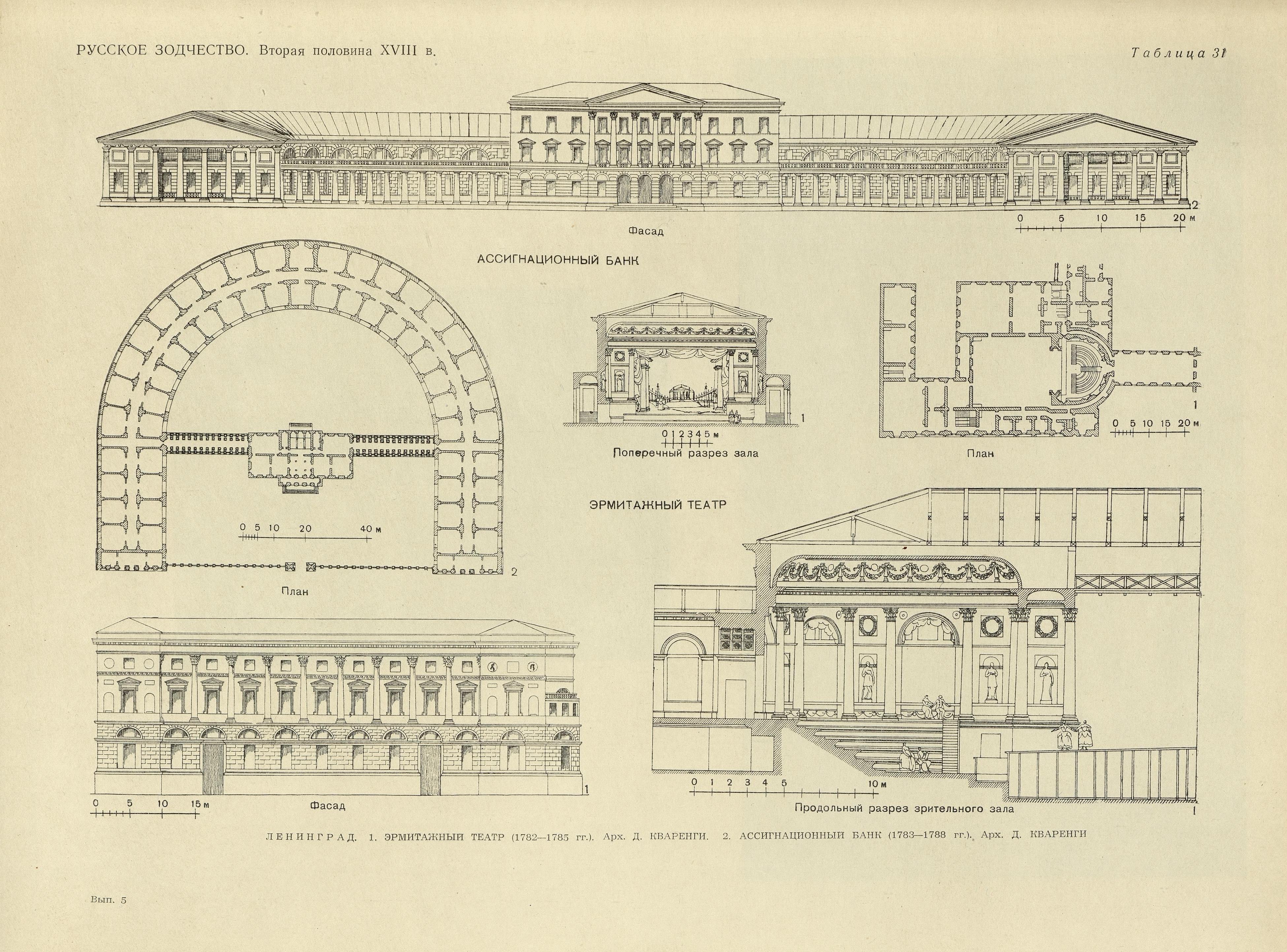 Таблица 31*. Ленинград: 1. Эрмитажный театр (1782—1785 гг.). Архитектор Д. Кваренги. 2. Ассигнационный банк (1783—1788 гг.). Архитектор Д. Кваренги