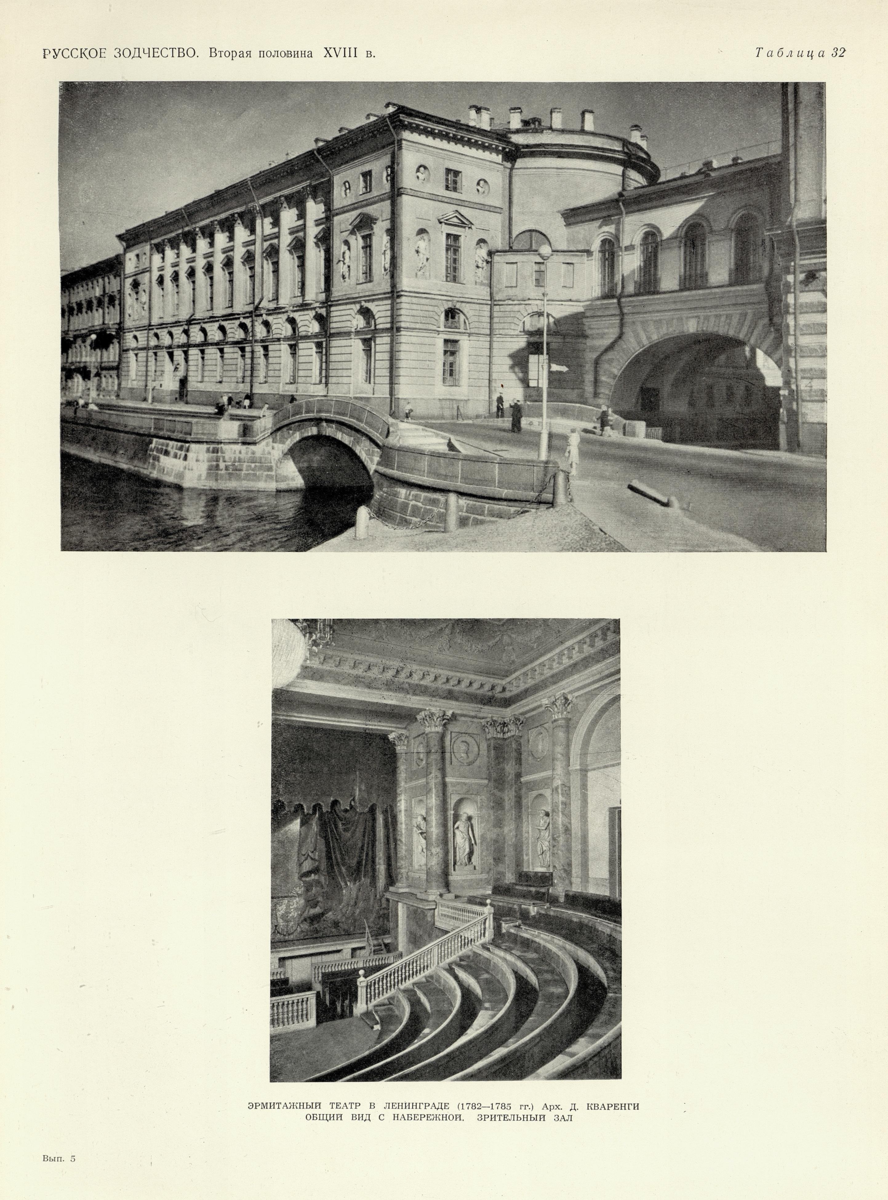Таблица 32. Эрмитажный театр в Ленинграде (1782—1785 гг.). Архитектор Д. Кваренги. 1. Общий вид с набережной (МРА). 2. Зрительный зал (МРА)