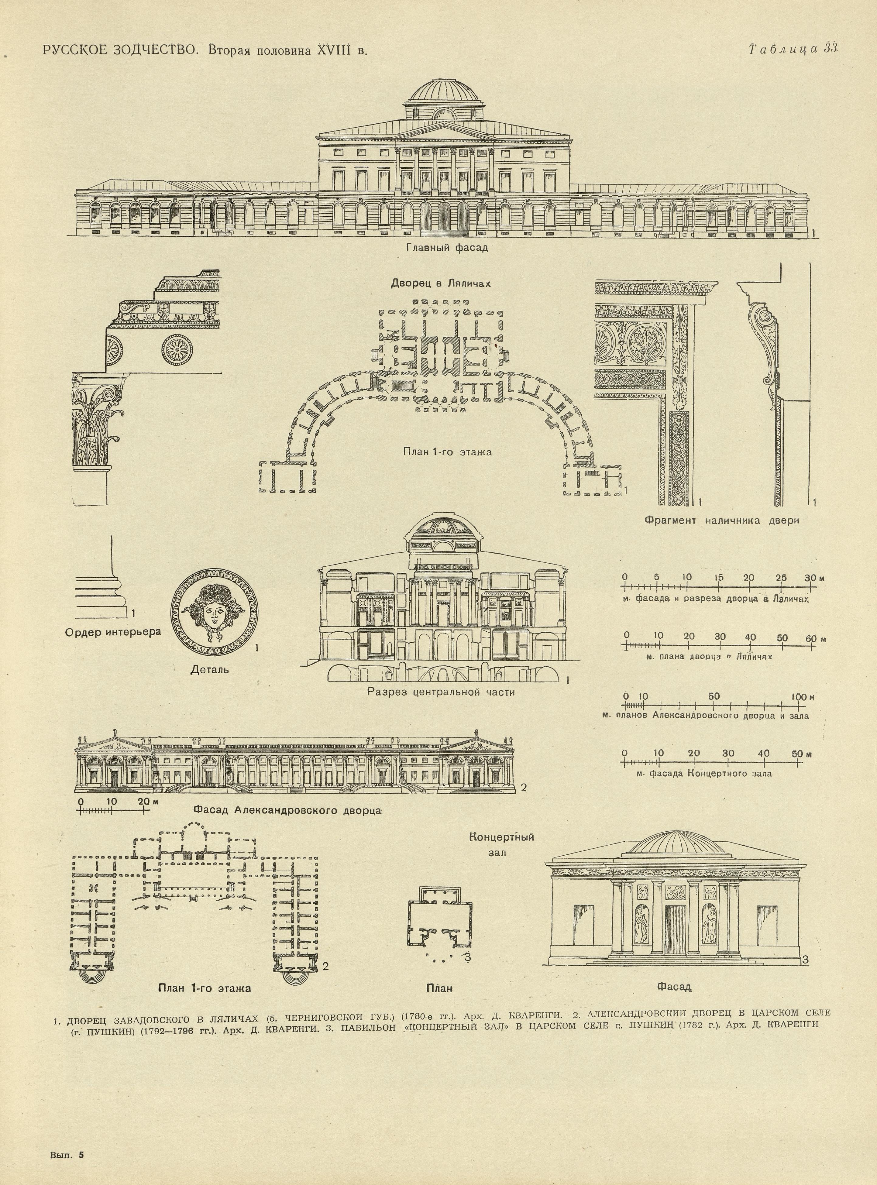 Таблица 33*. Дворец Завадовского в Ляличах (б. Черниговской губ.) (1780-е гг.). Архитектор Д. Кваренги. 2. Александровский дворец в Царском селе (г. Пушкине) (1792—1796 гг.). Архитектор Д. Кваренги. 3. Павильон «Концертный зал» в Царском селе (г. Пушкине) (1782 г.). Архитектор Д. Кваренги