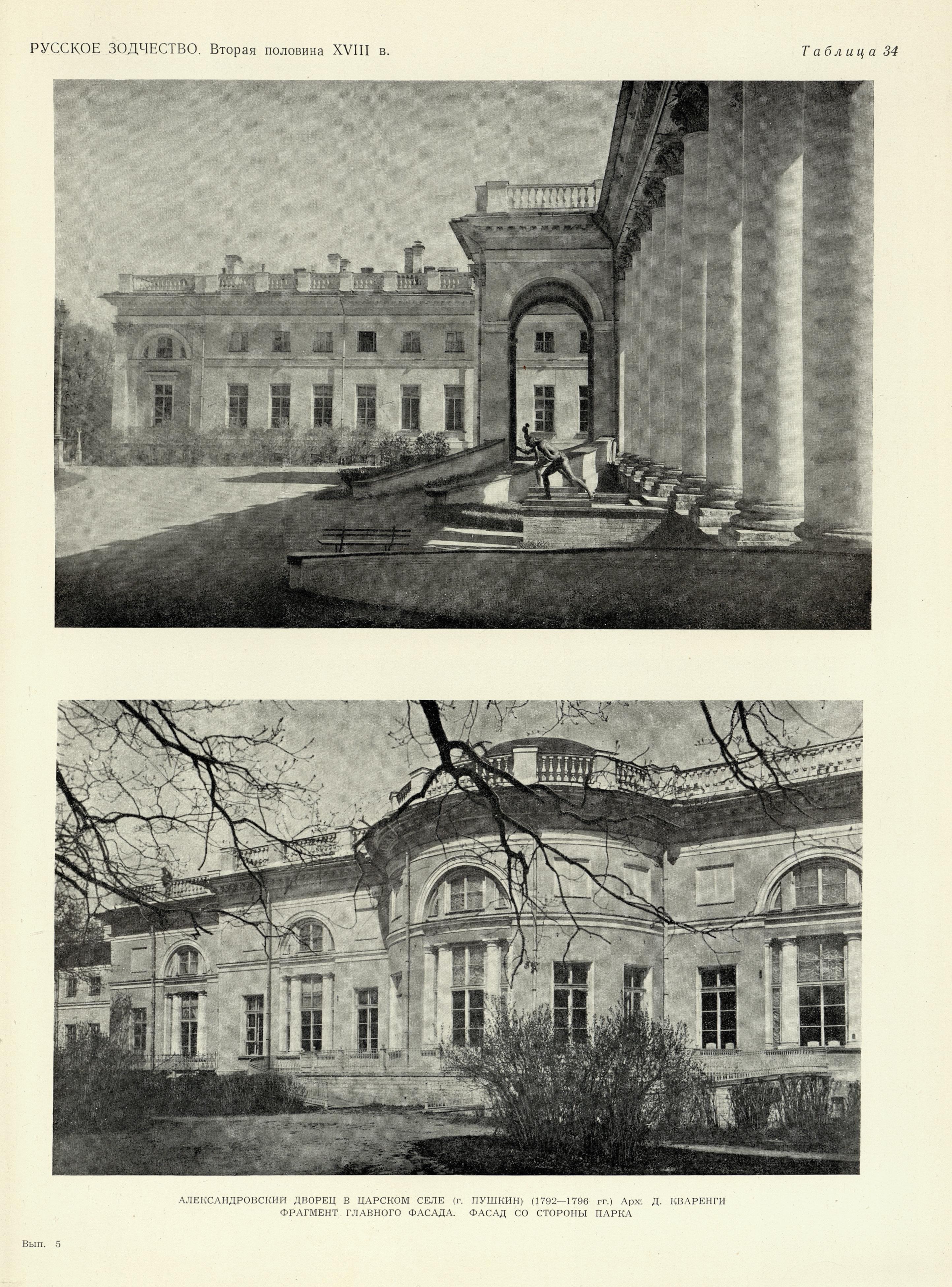 Таблица 34. Александровский дворец в Царском селе (г. Пушкине) (1792—1796 гг.). Архитектор Д. Кваренги. 1. Фрагмент главного фасада (МРА). 2. Фасад со стороны парка (МРА)