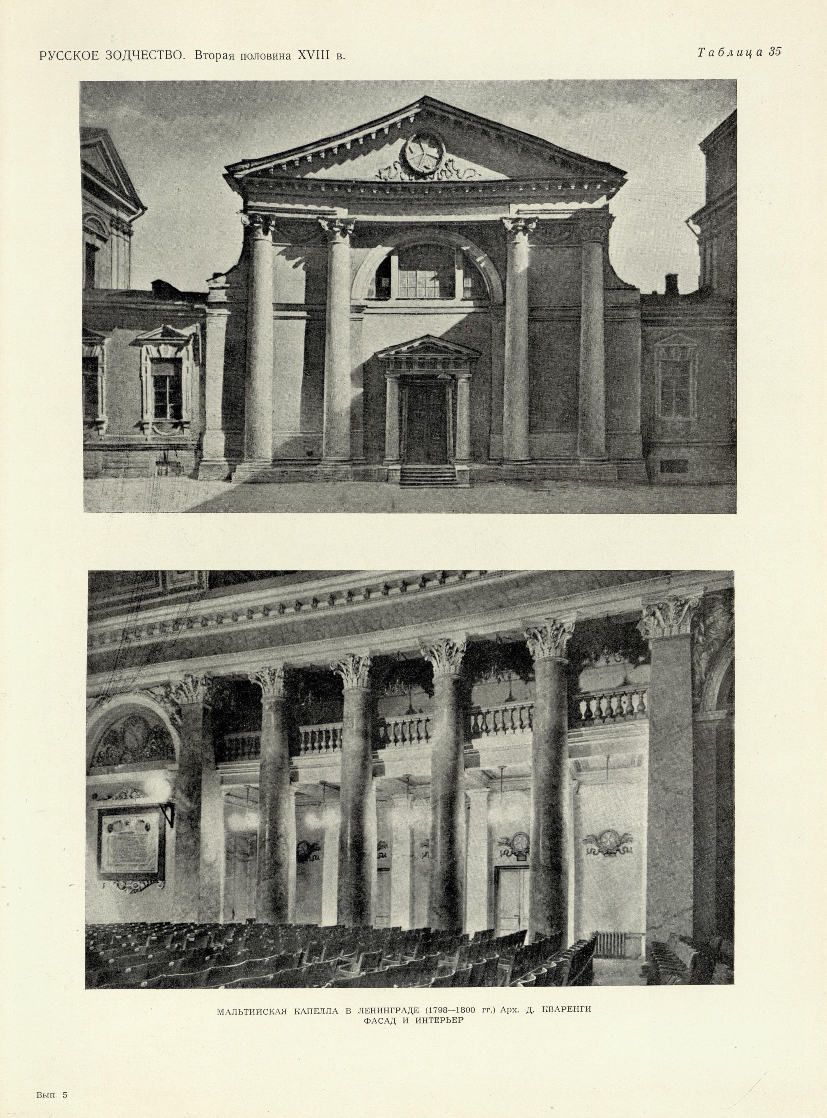 Таблица 35. Мальтийская капелла в Ленинграде (1798—1800 гг.). Архитектор Д. Кваренги. 1. Фасад 2. Интерьер (МРА)