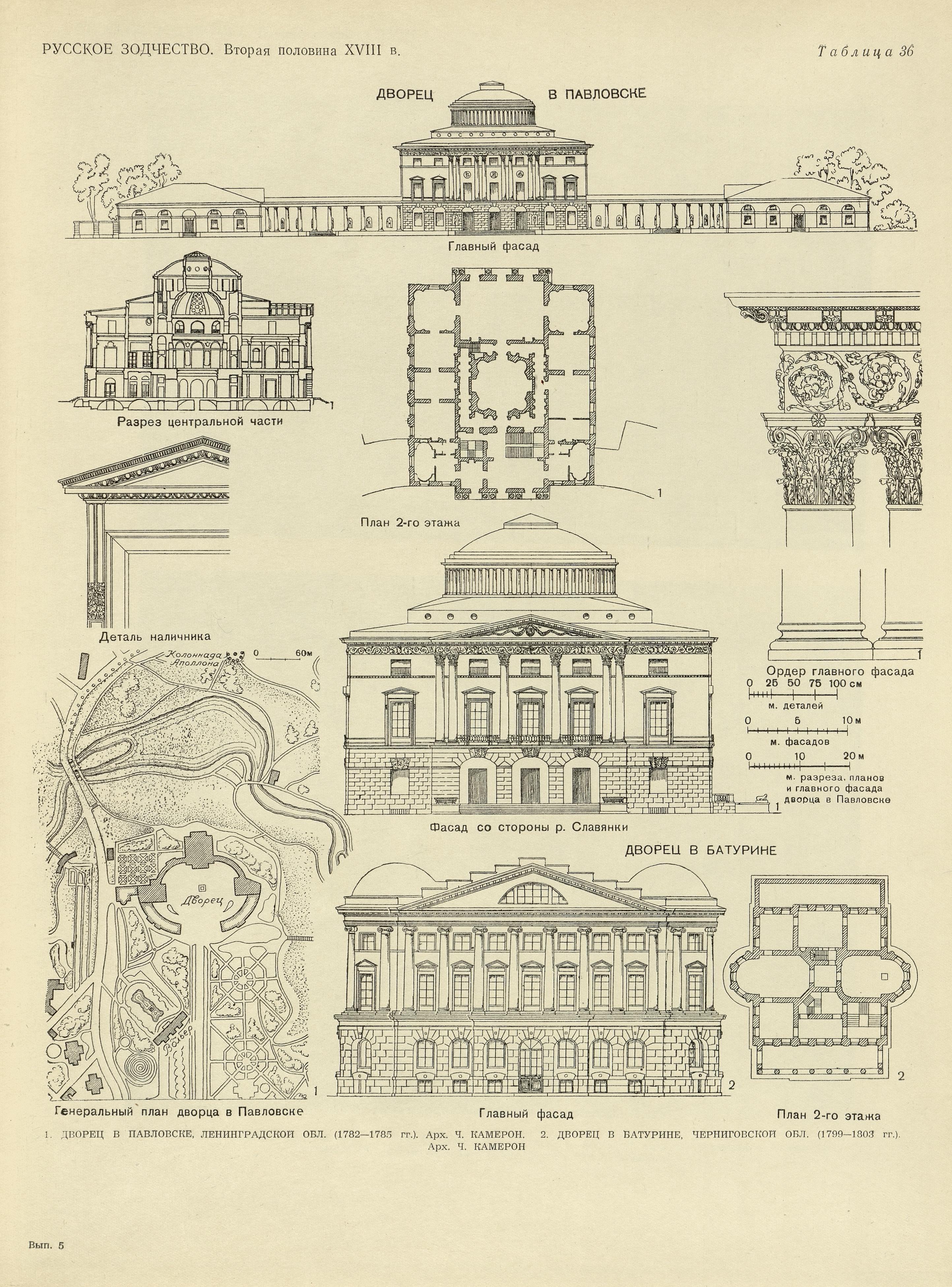 Таблица 36*. 1. Дворец в Павловске, Ленинградской области (1782—1785 гг.). Архитектор Ч. Камерон. 2. Дворец в Батурине, Черниговской области (1799—1803 гг.). Архитектор Ч. Камерон