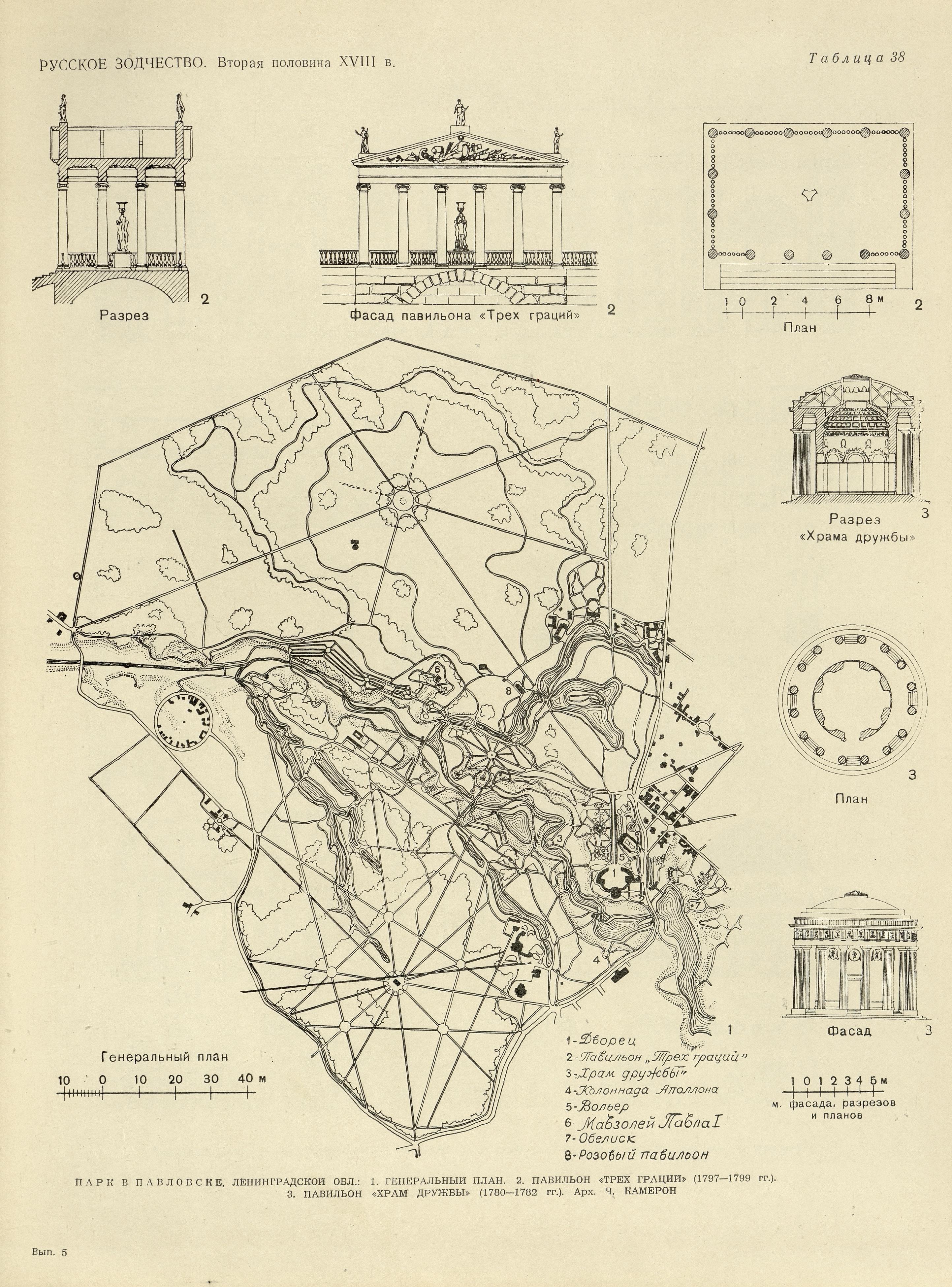 Таблица 38*. Парк в Павловске, Ленинградской области: 1. Генеральный план парка. 2. Павильон «Трех граций» (1797—1799 гг.). Архитектор Ч. Камерон. 3. Павильон «Храм дружбы» (1780—1782 гг.). Архитектор Ч. Камерон