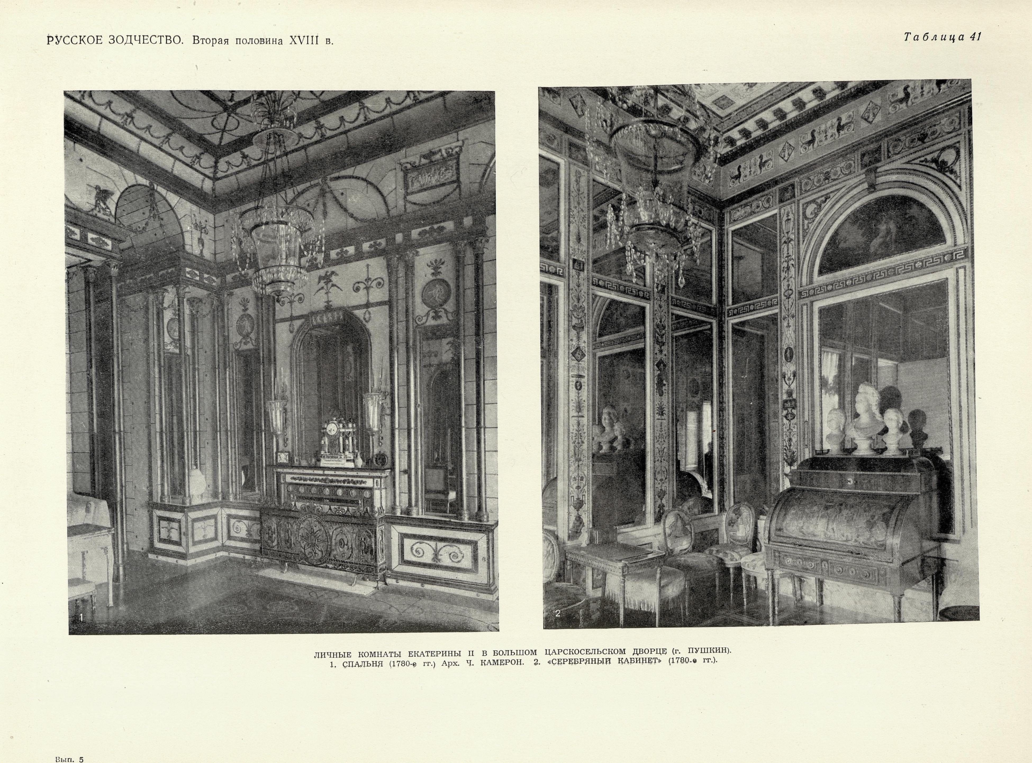 Таблица 41. Личные комнаты Екатерины II в Большом Царскосельском дворце (г. Пушкин): 1. Спальня (1780-е гг.). Архитектор Ч. Камерон. 2. Серебряный кабинет. Архитектор Ч. Камерон (1780-е гг.) (МАА)