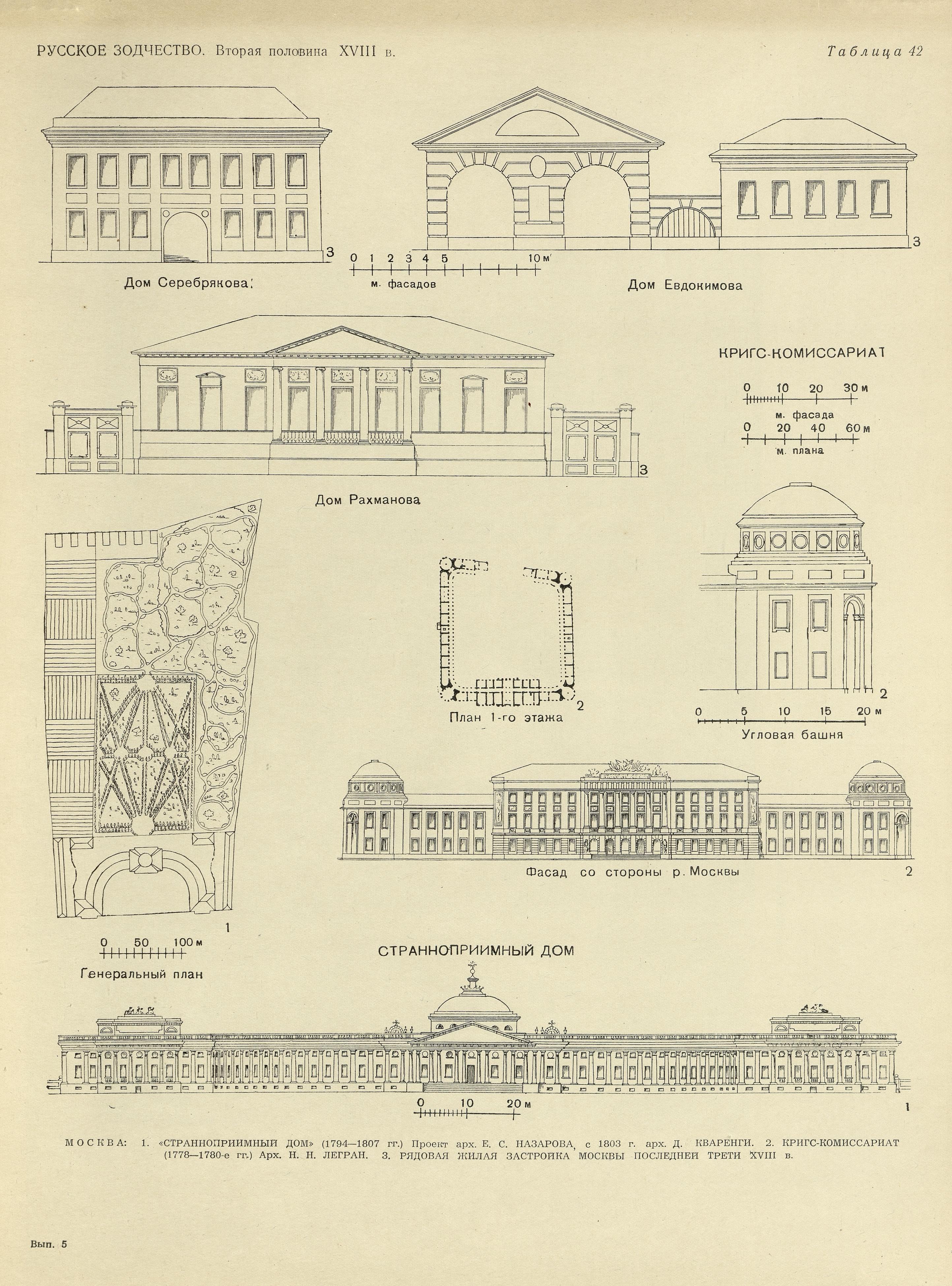 Таблица 42*. Москва: 1. «Странноприимный дом» (ныне Ин-т им. Склифосовского) (1794—1807 гг.). Проект архитектора Е. С. Назарова. 2. Кригс-комиссариат (1778—1780-е гг.). Архитектор Н. Н. Легран. 3. Рядовая жилая застройка последней трети XVIII в.