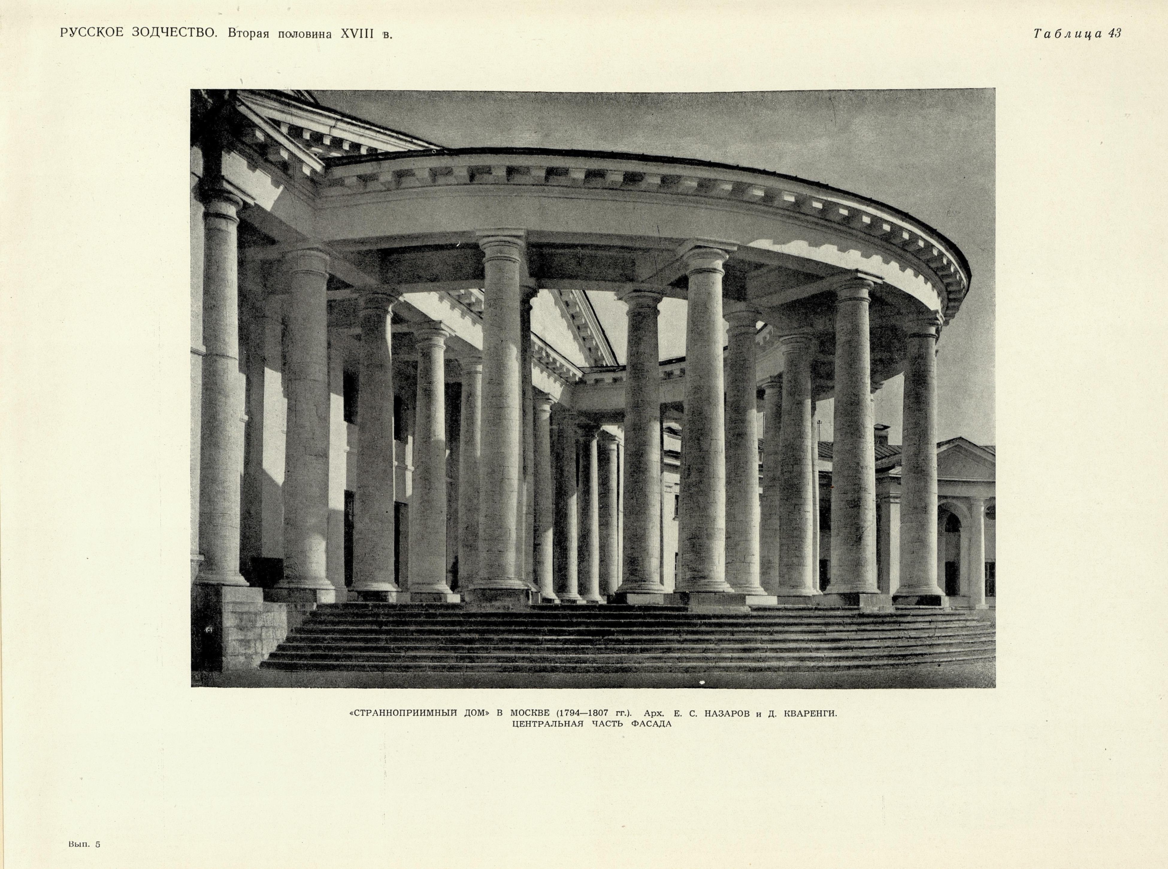 Таблица 43. «Странноприимный дом» в Москве (ныне Ин-т им. Склифосовского) (1794—1807 гг.). Архитекторы Е. С. Назаров и Д. Кваренги. Центральная часть фасада с ротондой (МАА)