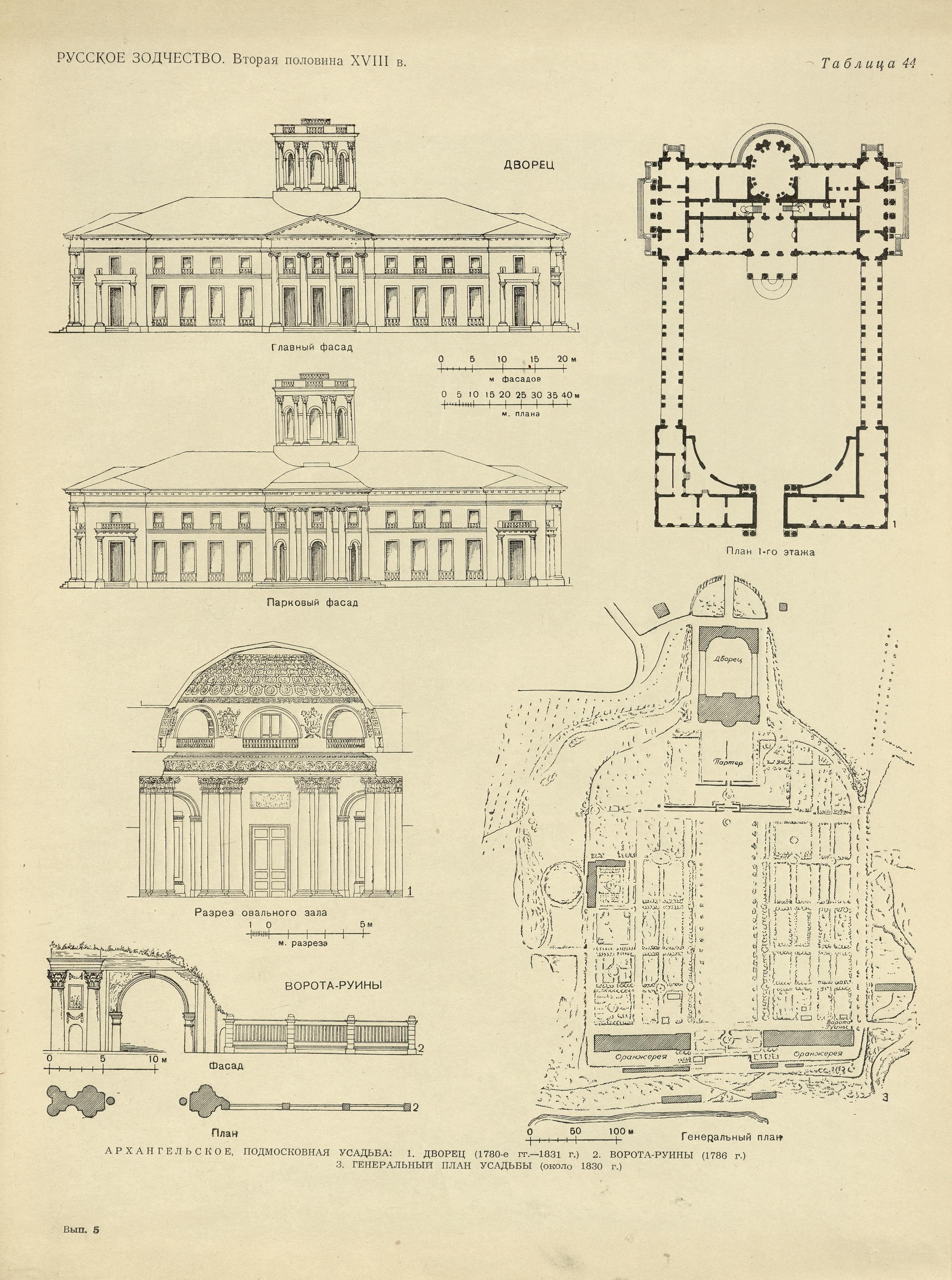 Таблица 44*. Архангельское, подмосковная усадьба: 1. Дворец (1780-е гг. — 1831 г.). 2. Ворота-руины (1786 г.). 3. Генеральный план усадьбы (около 1830 г.)