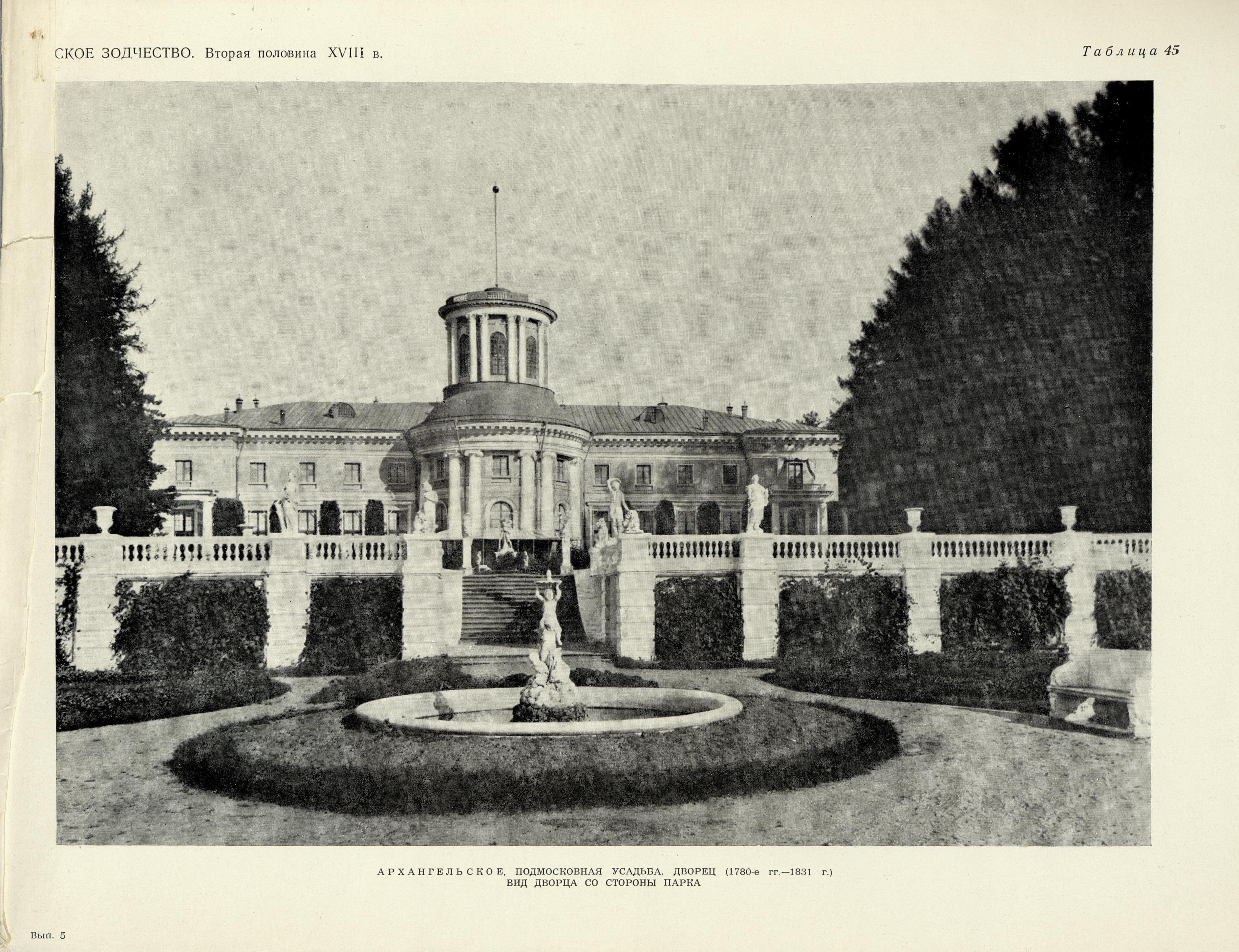 Таблица 45. Архангельское, подмосковная усадьба. Дворец (1780-е гг. — 1831 г.). Общий вид дворца и партера со стороны парка (Архитектурный кабинет Центрального дома архитектора)
