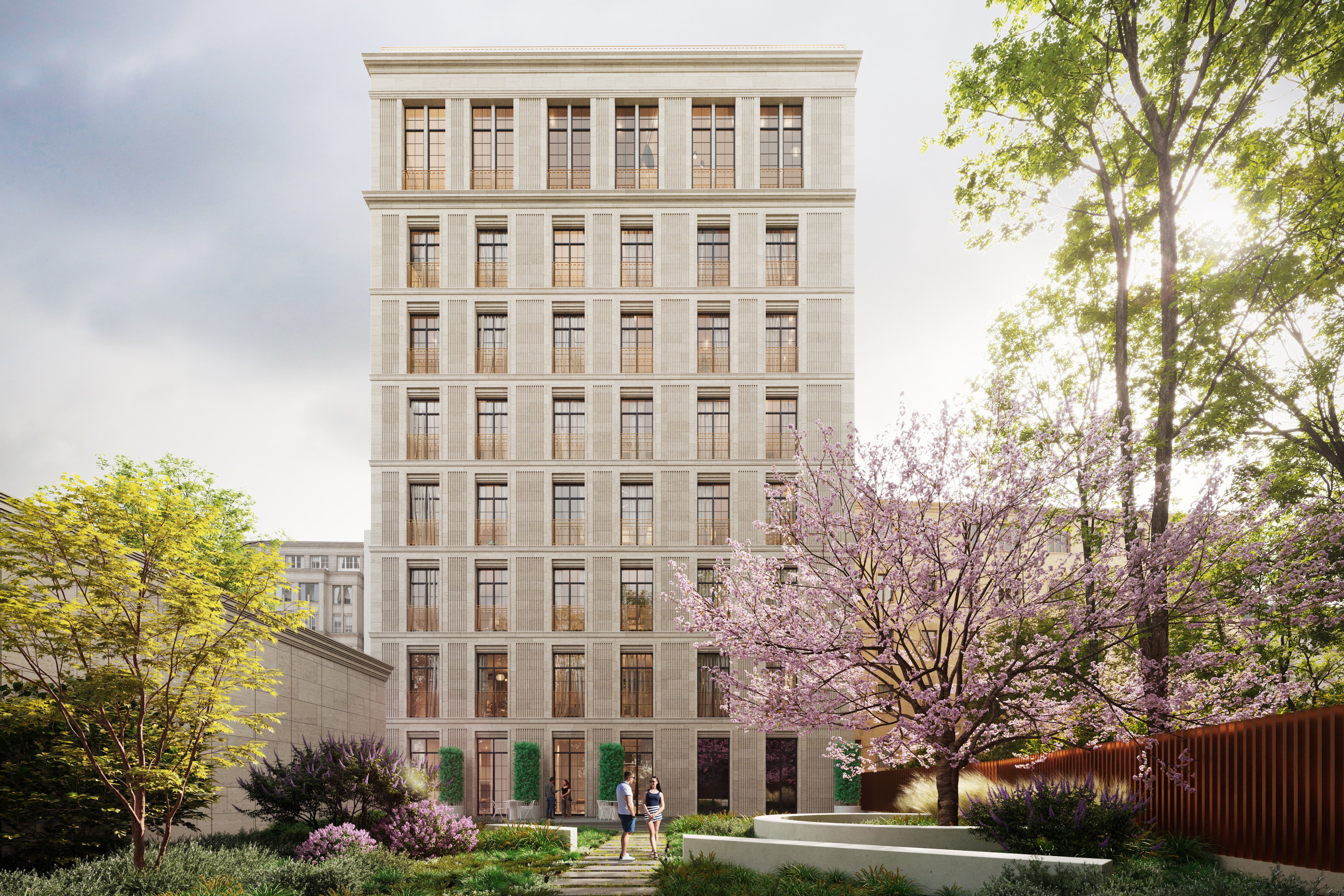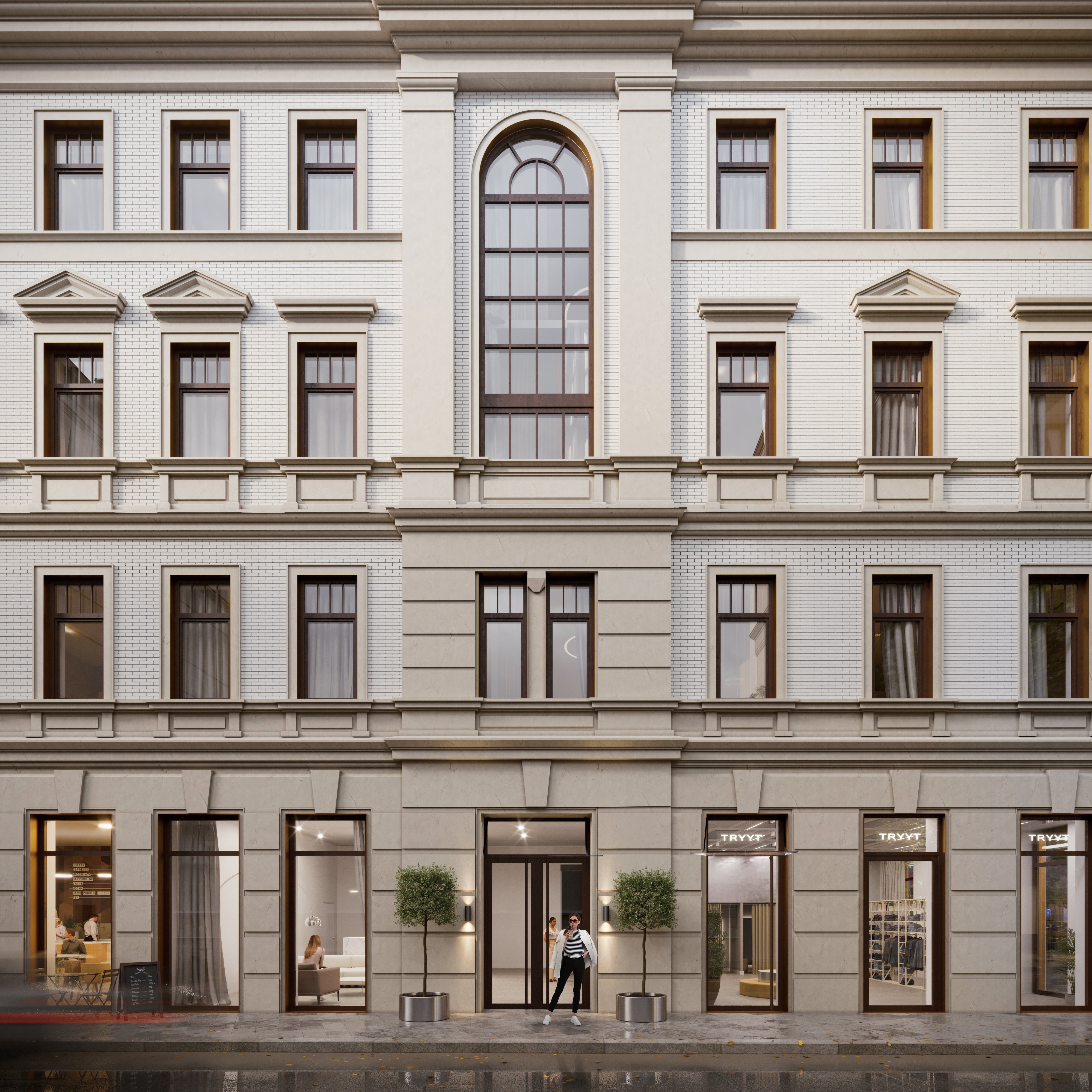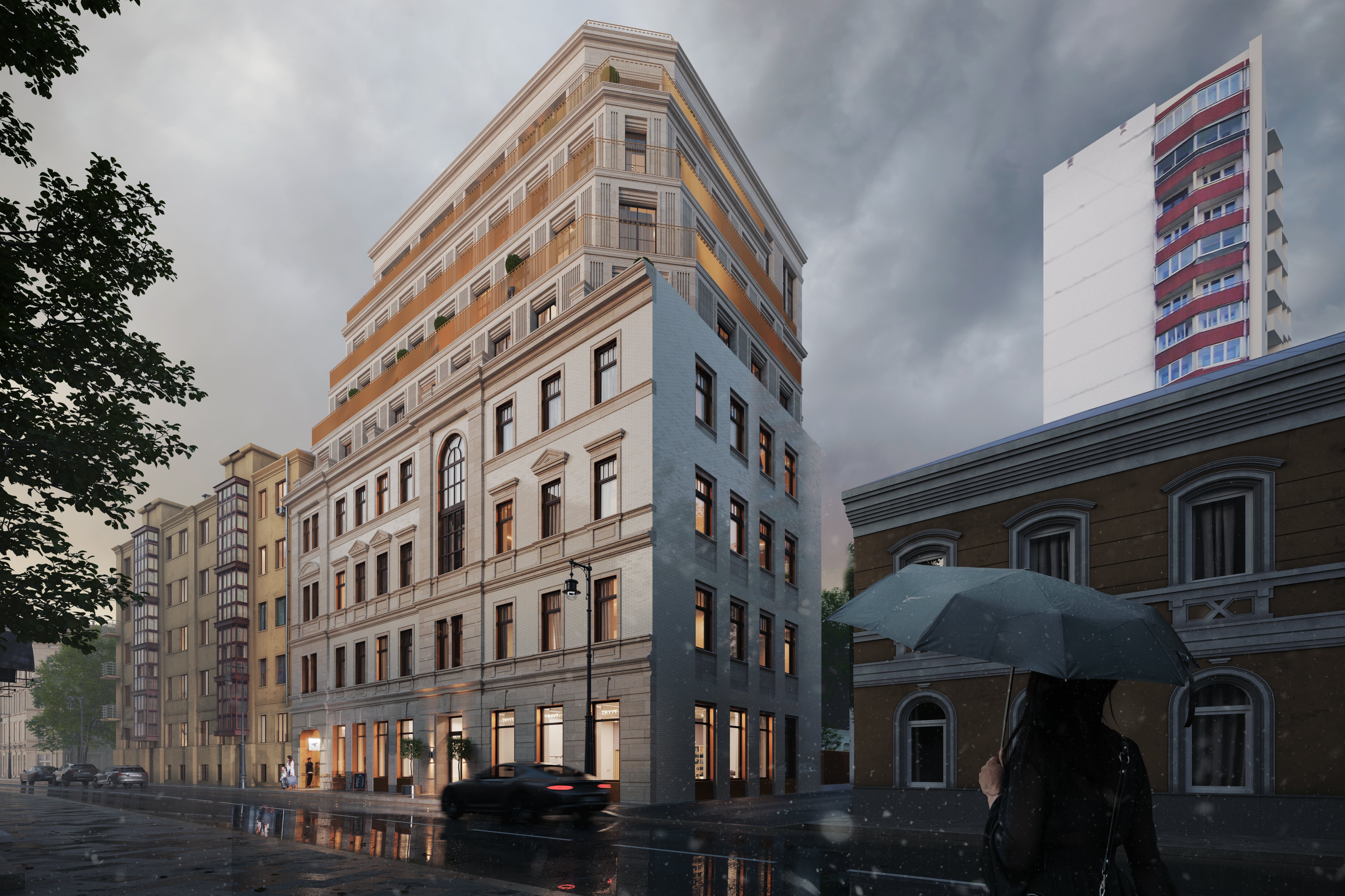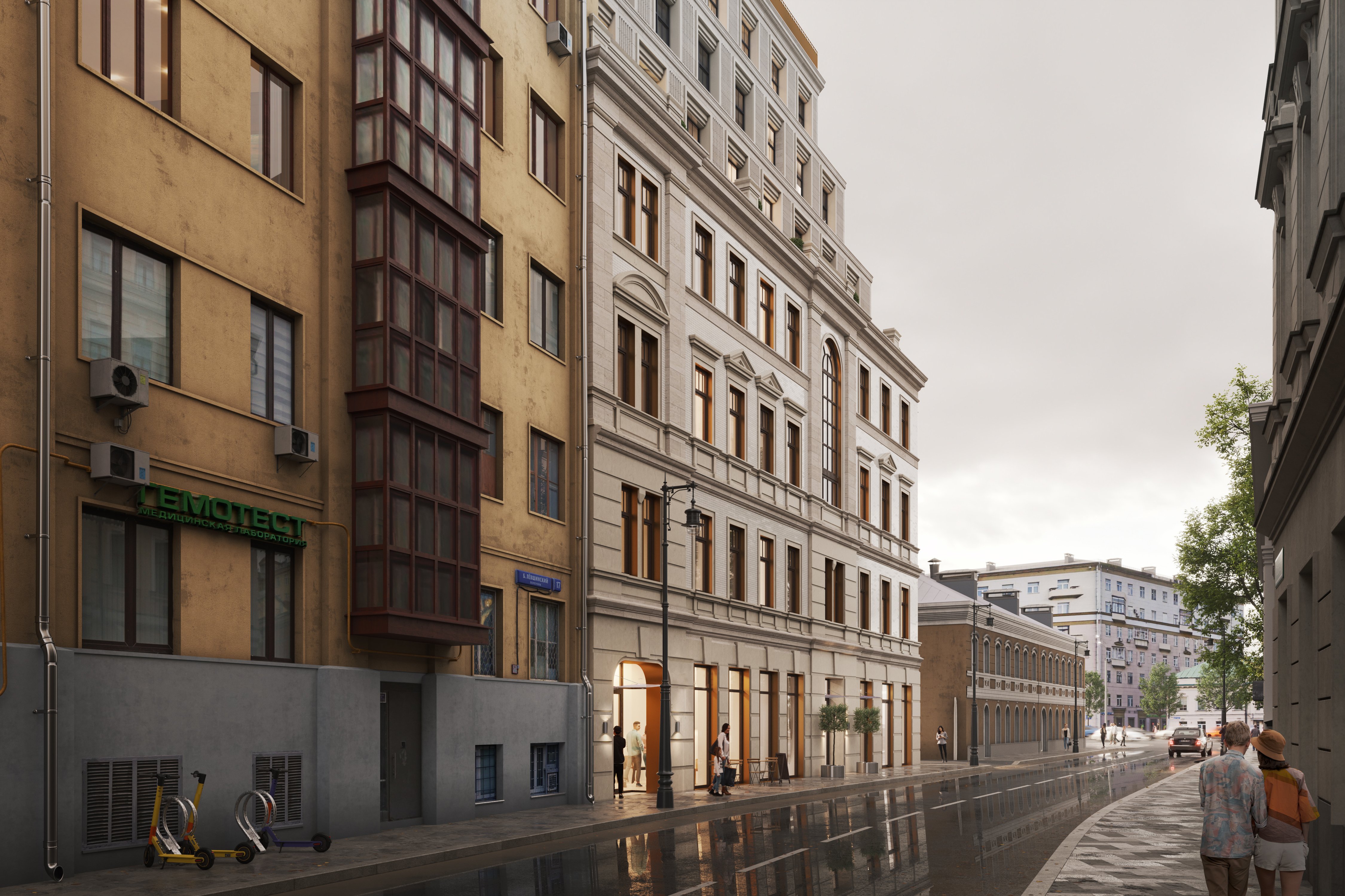 Проект от бюро HADAA предусматривает строительство восьмиэтажного здания общей площадью 3,6 тысячи квадратных метров. Архитектурное решение базируется на принципе визуального разделения объемов. Нижний ярус, соответствующий масштабу прежней постройки, детально воссоздает исторический фасад Ивана Мейснера с его характерным ритмом окон и декоративными элементами. Новые уровни надстраиваемой части спроектированы с последовательным смещением вглубь от красной линии переулка. Такой террасированный подход позволяет сохранить привычный силуэт застройки и минимизировать визуальное давление нового объема на историческую улицу. В отделке используются натуральный белый камень и глазурованный кирпич, что подчеркивает неоклассический характер проекта.