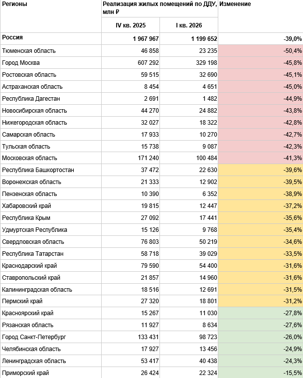 В большинстве субъектов России с крупными рынками строительства выручка девелоперов от продажи жилых помещений по договорам долевого участия в I квартале 2026 года рухнула на треть и более в сравнении с IV кварталом 2025 года. При этом в целом первый квартал продемонстрировал рекордную выручку относительно аналогичных периодов прошлых лет — следствие сохранения в начале года импульса от ожидаемых февральских изменений условий программы семейной ипотеки. Дальше будет хуже — предупреждают аналитики.